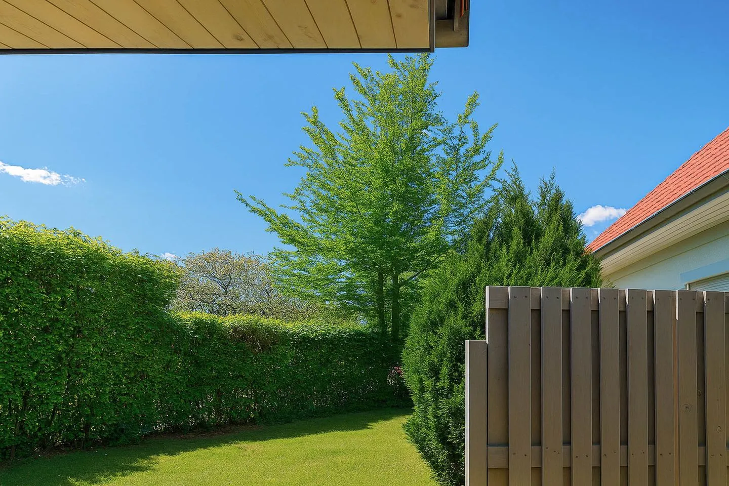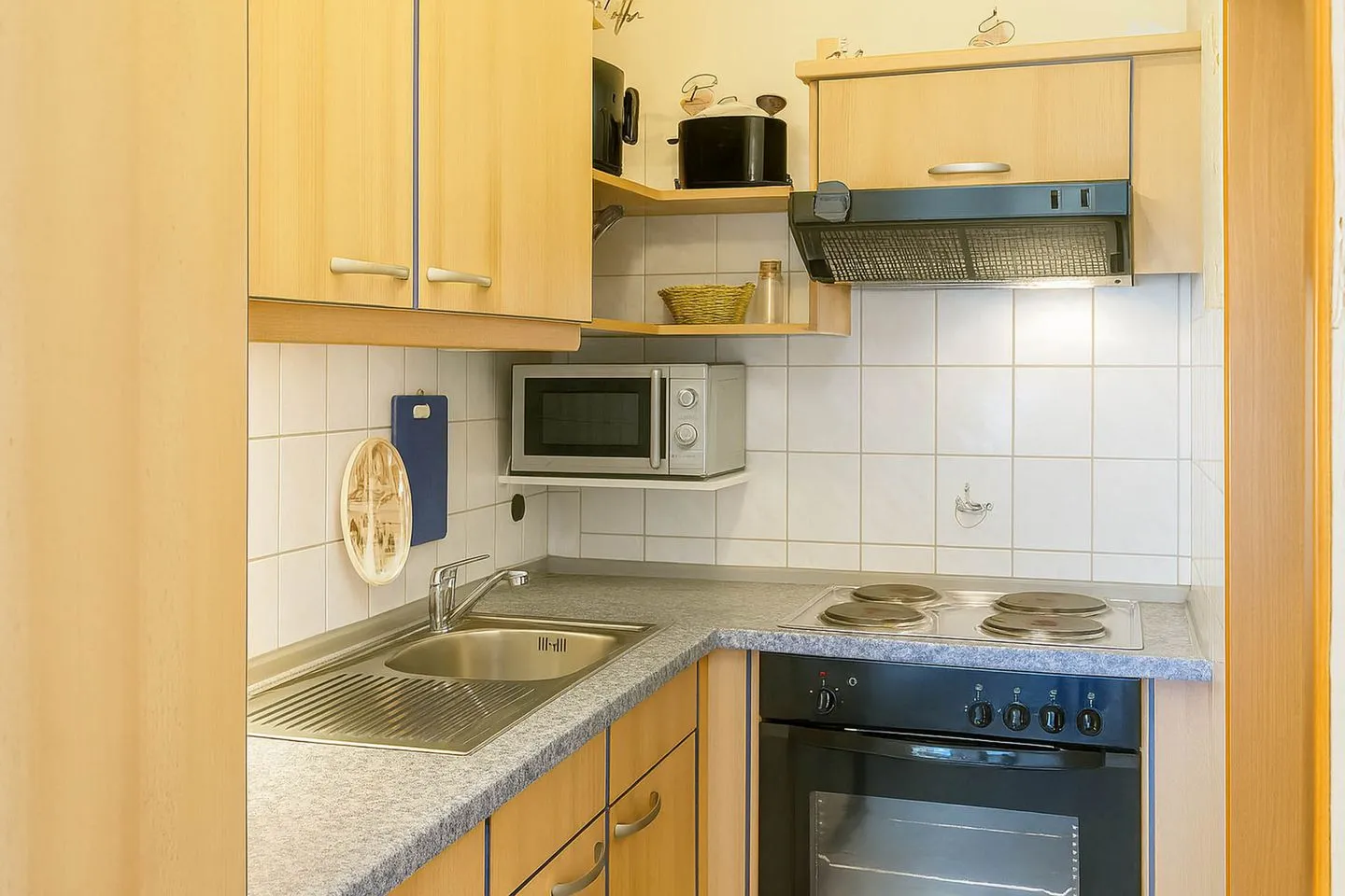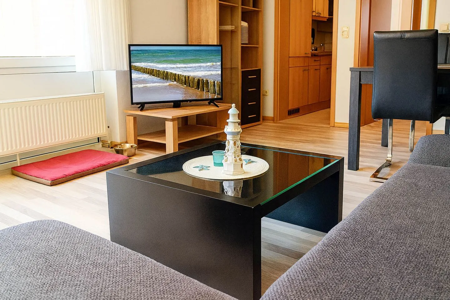 Die Ferienwohnung verfügt über einen eigenen Gartenbereich sowie eine sonnige Terrasse, die zu entspannten Stunden und geselligen Grillabenden einlädt. Perfekt geeignet für einen erholsamen Familienurlaub bietet sie Platz für zwei Erwachsene, zwei Kinder und ein zusätzliches Kleinkind. Beim Betreten der Wohnung gelangen Sie in einen einladenden Vorflur, von dem aus das moderne Duschbad, das Elternschlafzimmer und das gemütliche Wohnzimmer abgehen. Das Wohnzimmer mit Blick in den Garten lädt mit einem komfortablen Sofa zum Entspannen ein, während ein Flachbildfernseher für Unterhaltung sorgt. Die integrierte Essecke schafft eine angenehme Atmosphäre für gemeinsame Mahlzeiten. Die funktional ausgestattete Küche bietet alles, was Sie für die Zubereitung Ihrer Lieblingsgerichte benötigen – von einem Herd mit vier Kochplatten über einen Backofen und Kühlschrank bis hin zu Kaffeemaschine, Wasserkocher und Toaster.