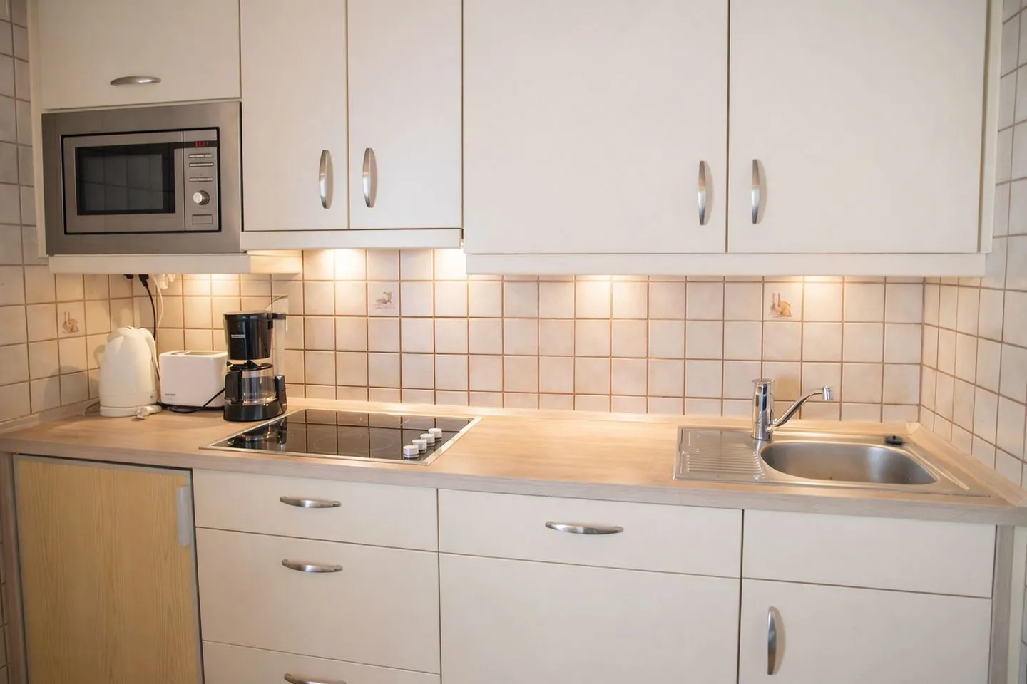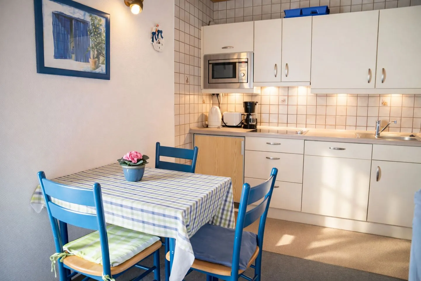Das separate Schlafzimmer ist mit einem komfortablen Doppelbett ausgestattet und bietet beste Voraussetzungen für erholsame Nächte. Dank eines praktischen Rollos lässt sich der Raum angenehm abdunkeln, sodass Sie auch nach ausgedehnten Strandspaziergängen oder sonnigen Tagen am Meer entspannt zur Ruhe kommen können. Der helle Wohn- und Essbereich bildet das Herzstück der Wohnung und überzeugt mit einer funktionalen, gut ausgestatteten Küchenzeile. Hier stehen Ihnen ein Cerankochfeld, eine Geschirrspülmaschine, ein Kühlschrank mit Gefriermöglichkeit, eine Mikrowelle sowie Kaffeemaschine, Wasserkocher und Toaster zur Verfügung, damit Sie Ihre Mahlzeiten ganz nach Ihren Wünschen zubereiten und im gemütlichen Ambiente genießen können. Ein Schrankbett steht hier für ein Kind zur Verfügung und bietet somit einen weiteren Schlafplatz. Auch hier lässt sich der Raum durch Außenrollos abdunkeln für geruhsame Nächte.