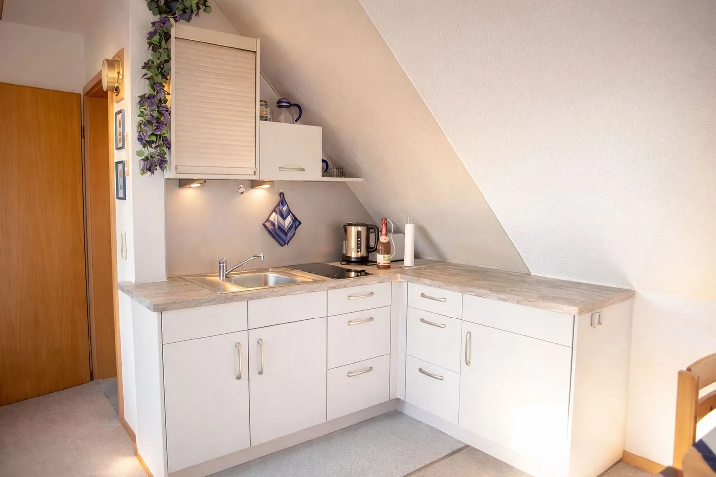 Schon beim Eintreten spüren Sie die entspannte Atmosphäre: Der helle Wohn- und Essbereich öffnet sich direkt zu Ihrem privaten Balkon, von dem aus Sie den Blick über den Deich schweifen lassen können. In den Wintermonaten blitzt sogar das Meer hervor – ein besonderer Moment, der jedes Frühstück verzaubert und laue Abende unter dem Sternenhimmel unvergesslich macht. Die praktische Küchenzeile ist ideal für den Urlaubsalltag ausgestattet und bietet mit dem Zwei-Platten-Cerankochfeld alles, um kleine Köstlichkeiten zuzubereiten, die Sie anschließend gemütlich im Wohnbereich genießen.
