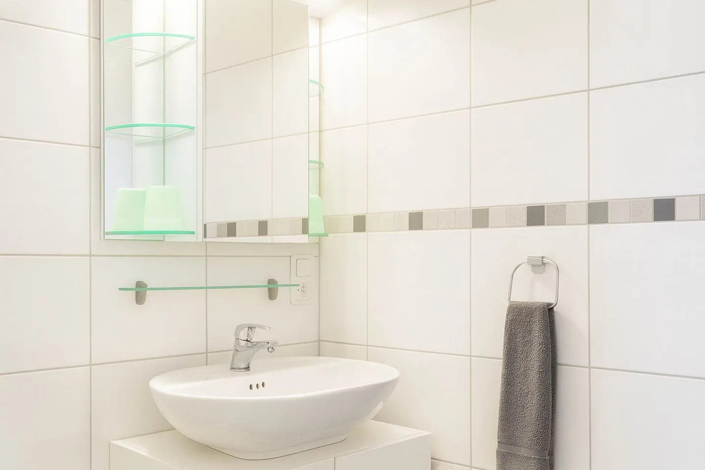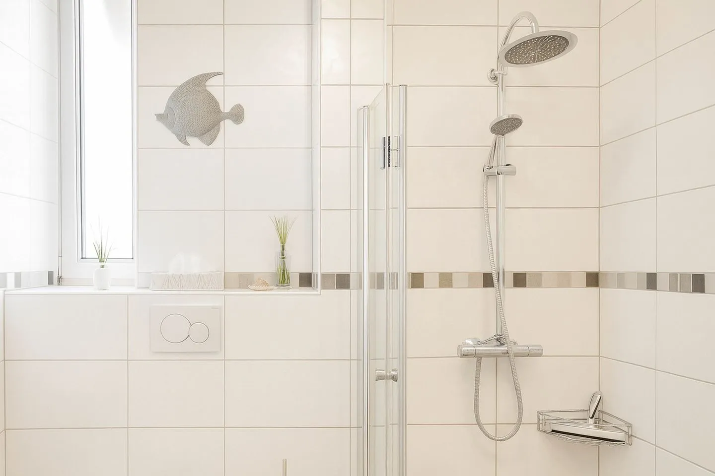 Das moderne Tageslichtbad beinhaltet außer WC und Waschtisch eine barrierefreie (Regen-)Dusche mit bodenebenem Einstieg.