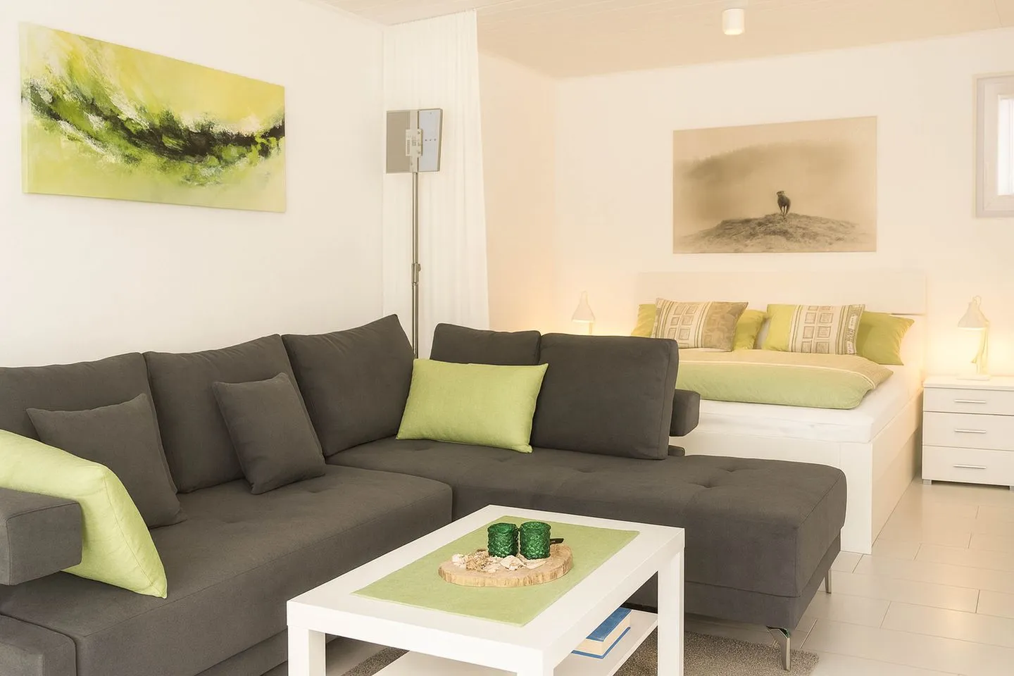 Im geräumige Wohnzimmer mit bodentiefen Fenstern und integriertem Essplatz, stehen Ihnen eine großzügige, elektrisch verstellbare Sitzgarnitur, Flachbildfernseher mit Smart TV, Amazon Fire TV, DVD Spieler mit Filmen und kostenloses WLAN zur Verfügung. In einer gemütlichen Nische, die blickdicht mit einem Vorhang zu schließen ist, befindet sich ein bequemes Doppelbett in Komforthöhe. Vom Wohnzimmer aus betreten Sie auch die sehr weiträumig gestaltete und möblierte, sonnige Südterrasse mit halber Überdachung und Markise. Der Blick und die Atmosphäre laden zum ausgedehnten Frühstück, ausgiebigen Sonnenbad oder romantischen Glas Wein in den Abendstunden ein.