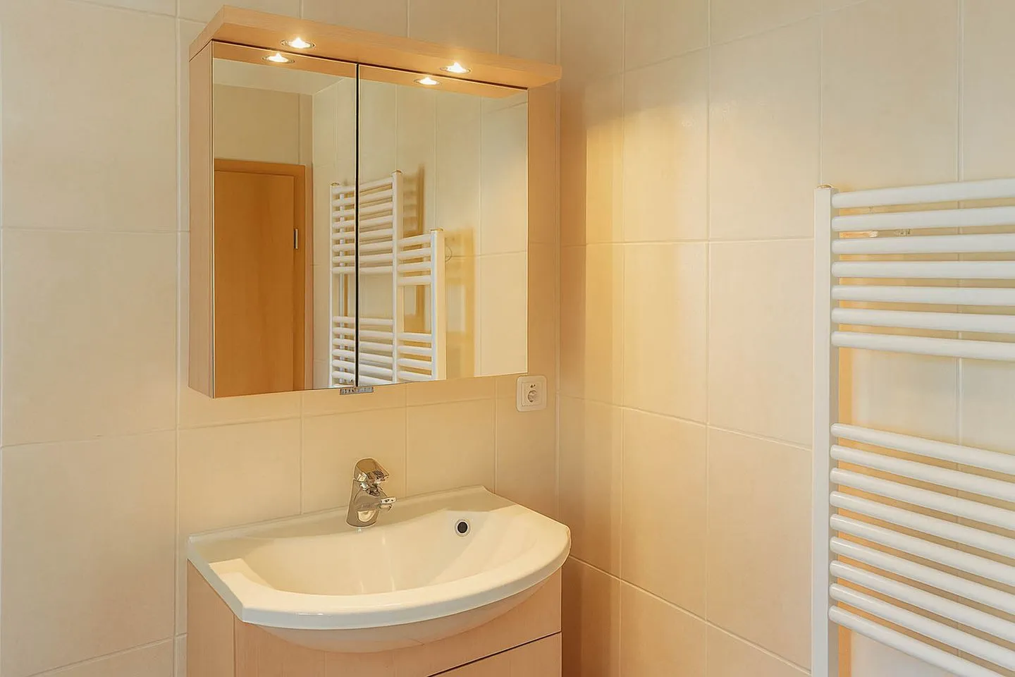Im ersten Obergeschoss befinden sich zwei gemütliche Schlafzimmer, die ebenfalls mit hochwertigen Massivholzmöbeln eingerichtet sind. Ein Schlafzimmer ist mit einem komfortablen Doppelbett ausgestattet, das zweite mit zwei Einzelbetten und eignet sich ideal für Kinder, Freunde oder weitere Mitreisende. Alle Fenster im Haus verfügen über Außenrollos, sodass sich die Räume vollständig verdunkeln lassen und Sie auch in den hellen Sommermonaten erholsam schlafen können.