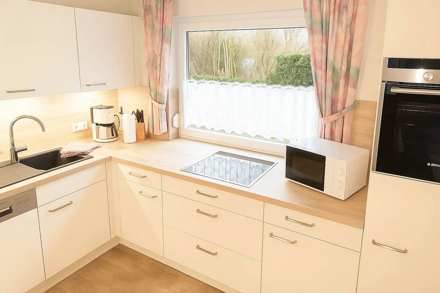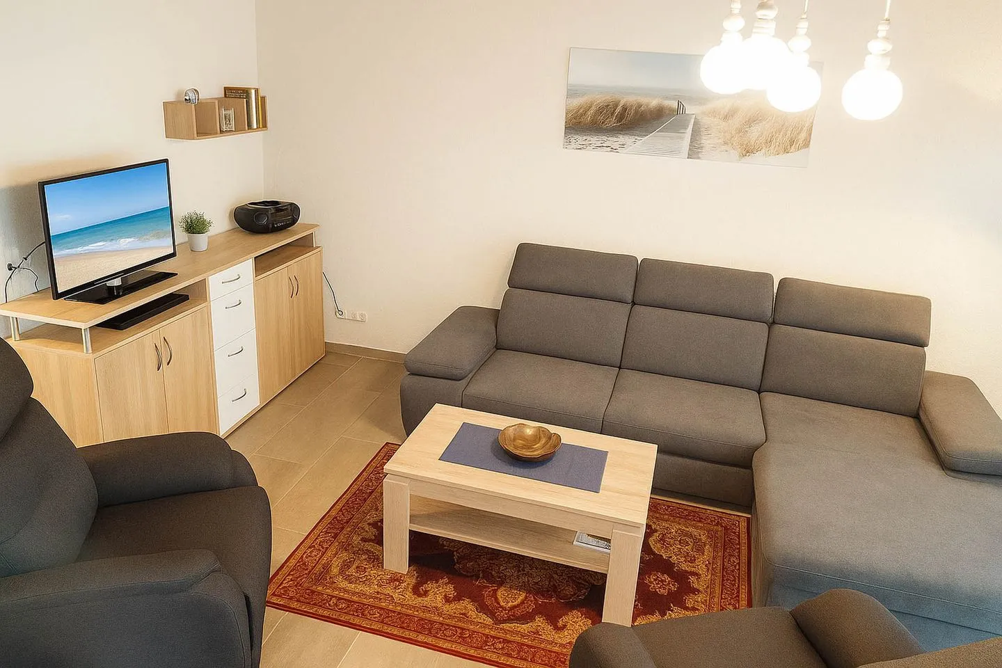 Im Erdgeschoss erwartet Sie eine offen gestaltete Wohnlandschaft, in der Kochen, Essen und Entspannen harmonisch ineinander übergehen. Die voll ausgestattete Küchenzeile lässt keine Wünsche offen und verfügt über Backofen, Cerankochfeld, Spülmaschine, Mikrowelle, Kaffeemaschine, Wasserkocher und Toaster, sodass Sie Ihre Mahlzeiten ganz bequem selbst zubereiten können. Die angrenzende Essecke lädt zu gemeinsamen Frühstücken oder geselligen Abenden ein. Der gemütliche Wohnbereich ist mit einem Flachbildfernseher und DVD-Player ausgestattet und bietet den idealen Ort für entspannte Stunden. Von hier aus gelangen Sie direkt auf die Terrasse mit Markise sowie in den Garten, wo Sie die frische Nordseeluft genießen, ein Sonnenbad nehmen oder den Tag in aller Ruhe ausklingen lassen können.