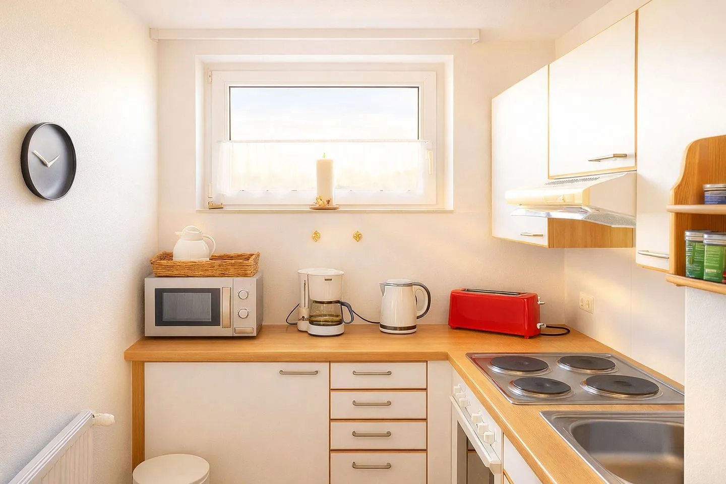 Das helle Wohnzimmer bildet das Herzstück der Wohnung und kombiniert gemütliches Wohnen mit einem integrierten Essplatz. Für Ihre Unterhaltung stehen Ihnen ein Flachbildfernseher, ein DVD-Player inklusive Filmen, eine Playstation mit Spielen sowie eine Stereoanlage zur Verfügung, sodass auch entspannte Abende bestens gestaltet sind. Die Küche präsentiert sich mit einer guten Ausstattung und bietet unter anderem einen Backofen, ein Kochfeld mit 4 Kochfeldern, einen Kühlschrank, Mikrowelle, Wasserkocher, Toaster und Wasserkocher und bietet ideale Voraussetzungen, um Mahlzeiten bequem selbst zuzubereiten.