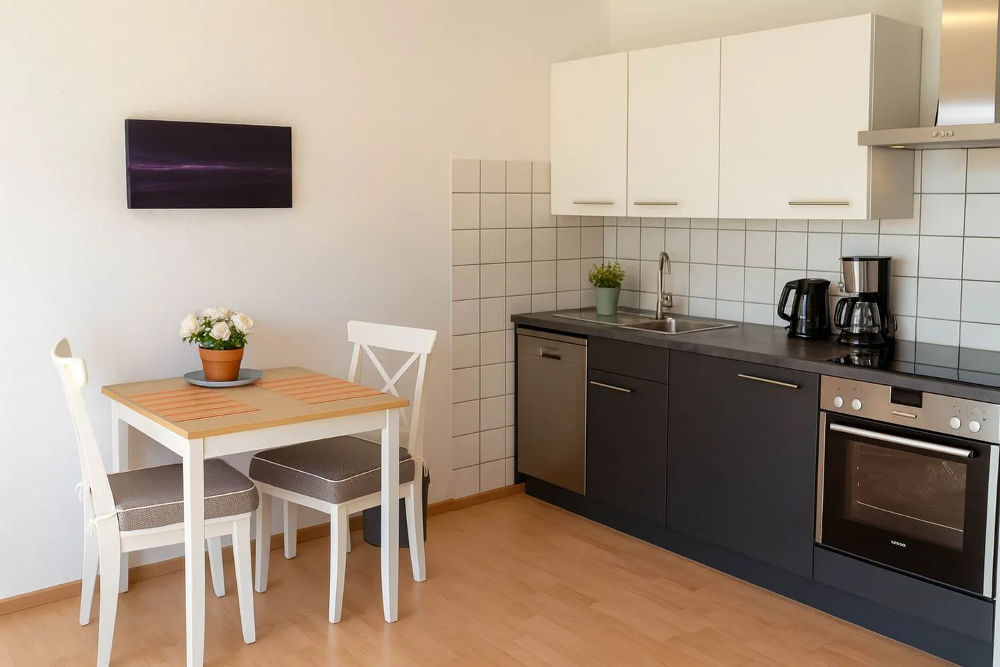 Die kleine, aber hochwertig ausgestattete Küchennische ist vollständig eingerichtet und verfügt über einen Backofen, eine Geschirrspülmaschine, einen Herd, einen Kühlschrank sowie eine Kaffeemaschine, einen Toaster und einen Wasserkocher. Der angrenzende Essbereich bietet einen gemütlichen Platz für gemeinsame Mahlzeiten. Das Badezimmer ist mit einer ebenerdigen Dusche, einem Waschbecken und einem WC ausgestattet, ein Fön steht Ihnen ebenfalls zur Verfügung. Das Schlafzimmer lädt mit einem komfortablen Doppelbett zu erholsamen Nächten ein und bietet eine angenehme Rückzugsmöglichkeit nach erlebnisreichen Urlaubstagen.