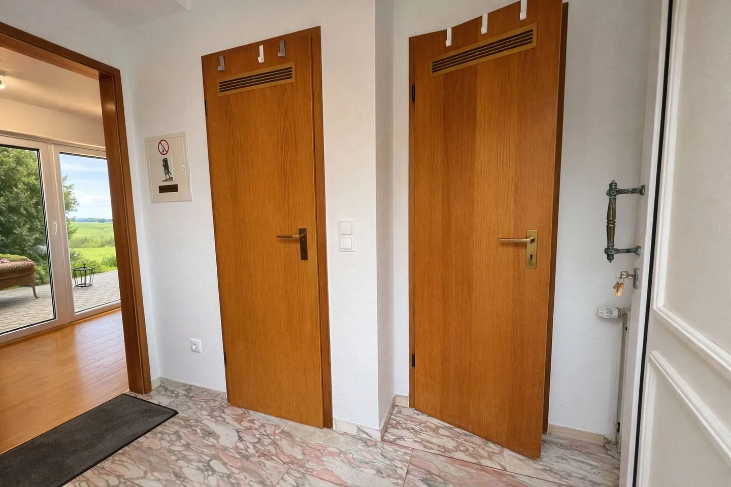 Die Wohnung präsentiert sich in einem hellen, freundlichen und zeitgemäßen Stil. Das gemütliche Wohnzimmer lädt zum Verweilen ein und ist mit einem Sat-TV ausgestattet. Von hier aus gelangen Sie direkt auf die großzügige Terrasse, die besonders in den Abendstunden zu entspannten Momenten einlädt. Genießen Sie hier bei einem Glas Wein die letzten Sonnenstrahlen des Tages und den freien Blick über die angrenzenden Felder in Richtung Crildumersiel, der für eine besonders erholsame Atmosphäre sorgt.