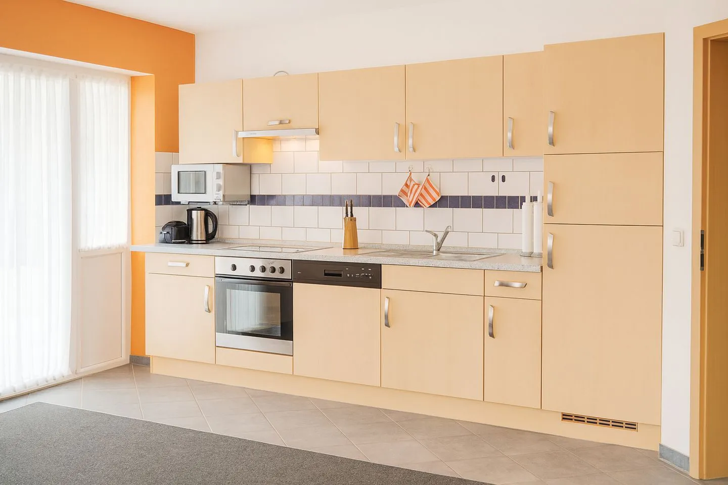 Die komfortable Wohnung ist behindertengerecht gestaltet und verfügt über zwei separate Schlafzimmer, die ausreichend Platz für Familien oder Paare bieten. Ein Schlafzimmer ist mit einem komfortablen Doppelbett ausgestattet, während das zweite Schlafzimmer über zwei Einzelbetten verfügt und sich ideal für Kinder, Freunde oder Begleitpersonen eignet. Der offen gestaltete Wohnbereich verbindet Wohnen, Kochen und Essen zu einem harmonischen Mittelpunkt der Wohnung. Die integrierte Küche ist hervorragend ausgestattet und lässt keine Wünsche offen. Sie verfügt über Backofen, ein Ceranherd, Kühlschrank mit Gefrierfach, Geschirrspüler und Mikrowelle, Kaffeemaschine, Wasserkocher und Toaster, sodass Sie sich im Urlaub ganz flexibel selbst versorgen können.