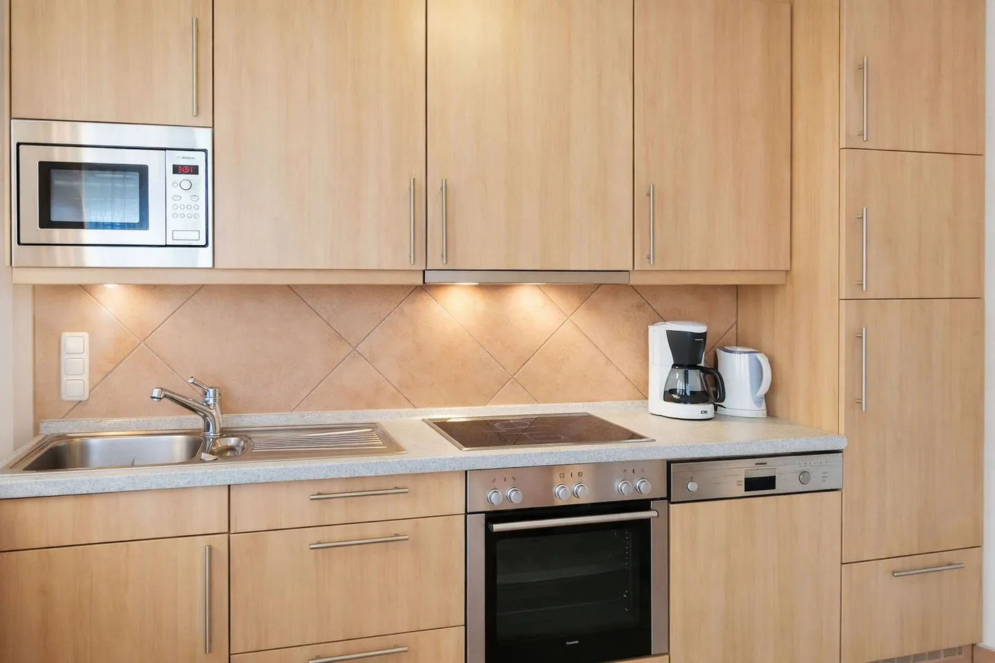 Komplett eingerichteten Einbauküche (Herd, Backofen, Mikrowelle, Kühlschrank, kleiner Gefrierschrank, Spülmaschine, Kaffeemaschine, Toaster u.v.m.)