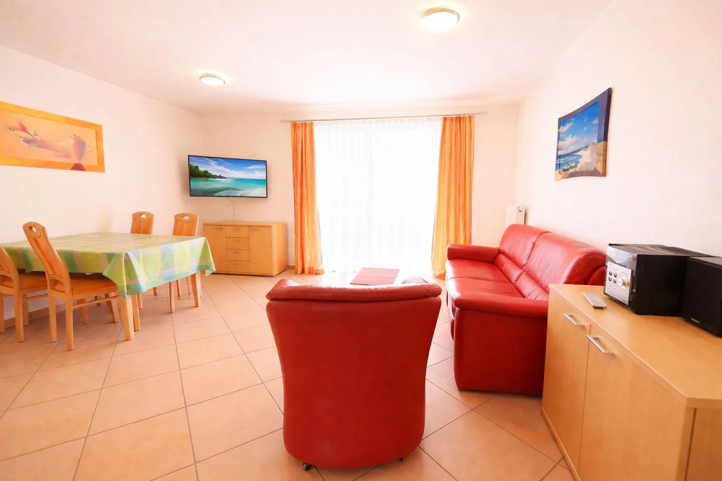 Offener Wohn-, Ess- und Kochbereich mit gemütlicher Polstersitzgruppe, TV, Radio/CD-Player sowie einer komplett eingerichteten Einbauküche
