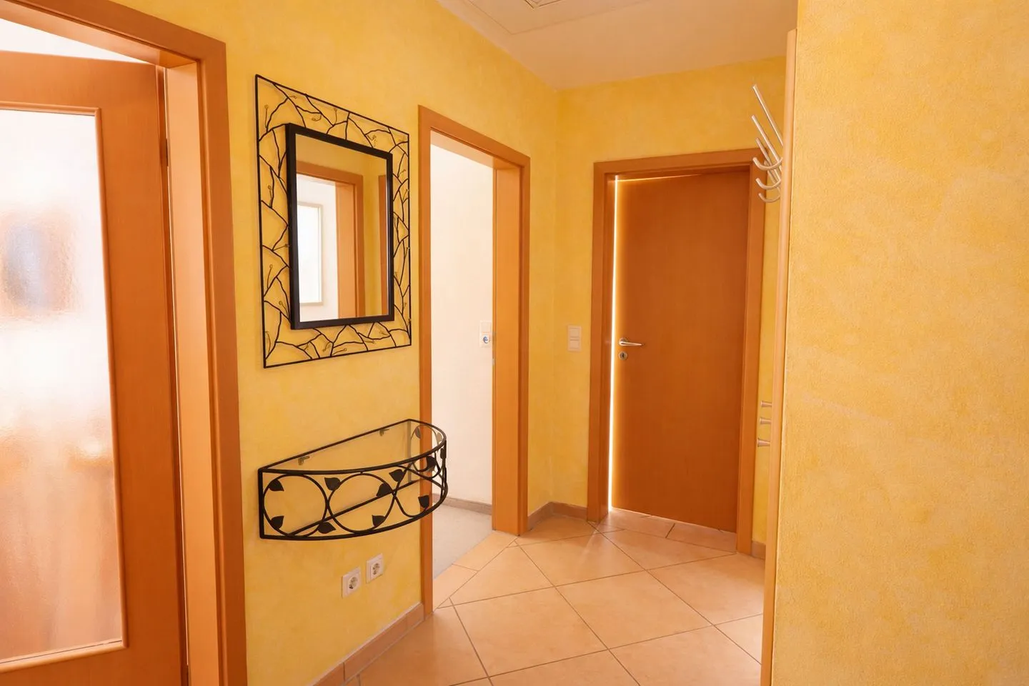 Zwei liebevoll eingerichtete Schlafzimmer verfügen über komfortable Doppelbetten, Teppichboden und geräumige Schränke, während ein weiteres Schlafzimmer mit einem Einzelbett zusätzlichen Platz bietet – ideal für Familien. Das Badezimmer mit Tageslicht ist modern gestaltet und mit Dusche und WC ausgestattet. Alle Fenster der Wohnung verfügen über elektrische Rollläden, die für zusätzlichen Komfort und erholsamen Schlaf sorgen.