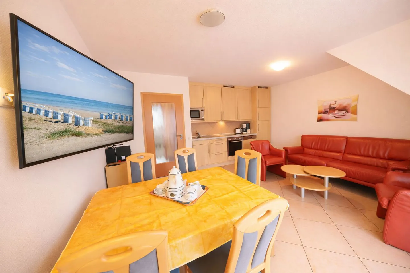 Die rund 60 m² große Wohnung bietet Platz für bis zu fünf Personen und verbindet gemütliches Wohlfühlambiente mit praktischer Ausstattung. Der offene Wohn-, Ess- und Küchenbereich lädt mit einer bequemen Polstersitzgruppe, Fernseher, Radio und CD-Player zu entspannten Stunden ein. Die moderne Einbauküche ist vollständig ausgestattet – mit Herd, Backofen, Mikrowelle, Kühlschrank, kleinem Gefrierschrank, Geschirrspülmaschine, Kaffeemaschine, Toaster und vielem mehr – und lässt keine Wünsche offen. Vom Wohn- und Essbereich gelangen Sie direkt auf den sonnigen Balkon, der mit ansprechenden Gartenmöbeln zum Verweilen einlädt.