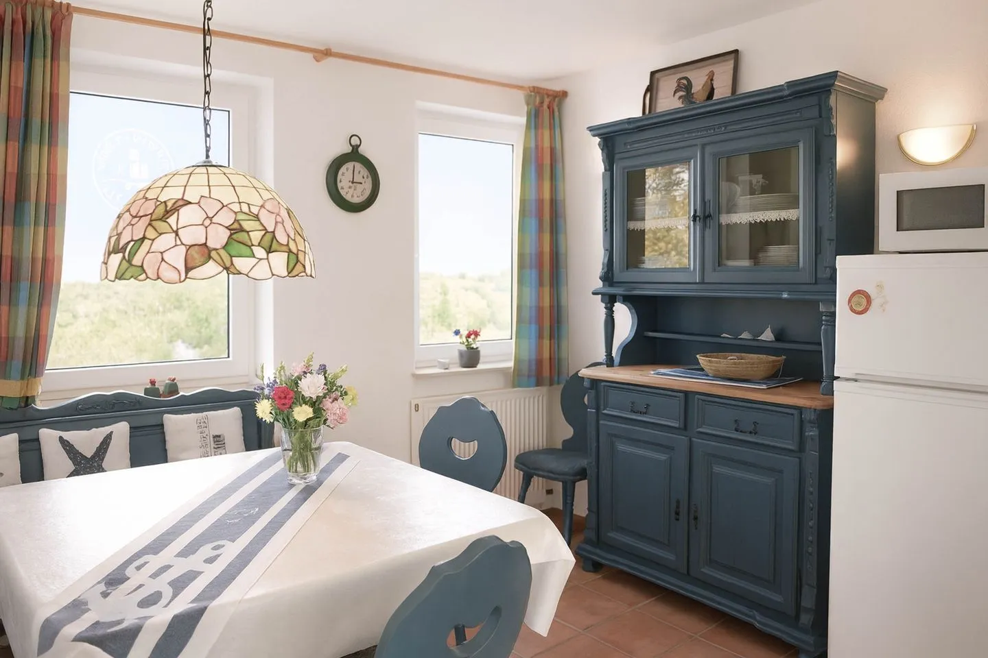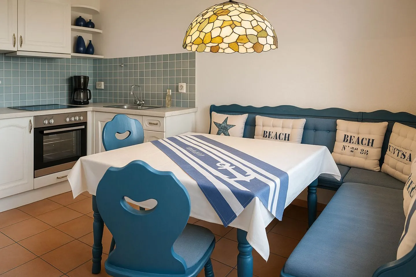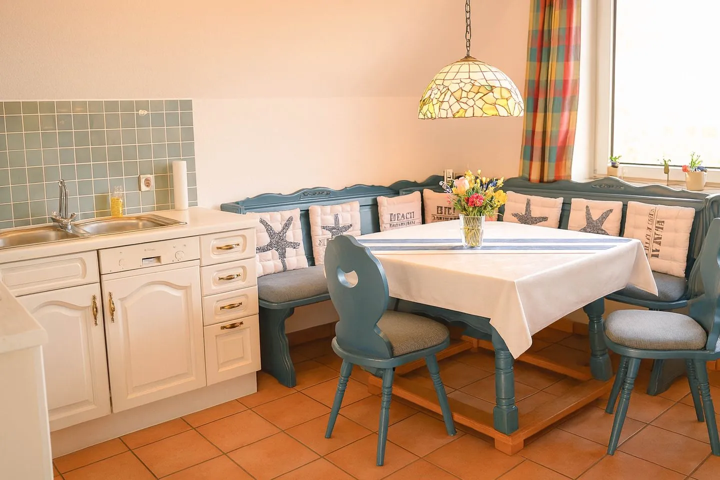 Die geräumige Wohnküche ist vollständig ausgestattet und lässt keine Wünsche offen. Ein Backofen mit Ceranfeld, Geschirrspülmaschine, Mikrowelle, Kühl-Gefrierkombination, Kaffeemaschine, Wasserkocher und Toaster sorgen dafür, dass Sie sich im Urlaub bequem selbst versorgen können. Das großzügige Wohnzimmer lädt mit einem bequemen Ledersofa, Fernseher mit Kabelanschluss und DVD-Player zu entspannten Stunden ein. Von hier aus gelangen Sie direkt auf die sonnige Terrasse, die zum Verweilen einlädt und dank ihrer Süd-West-Ausrichtung bis in die Abendstunden Sonne bietet – ideal für einen entspannten Ausklang des Tages.
