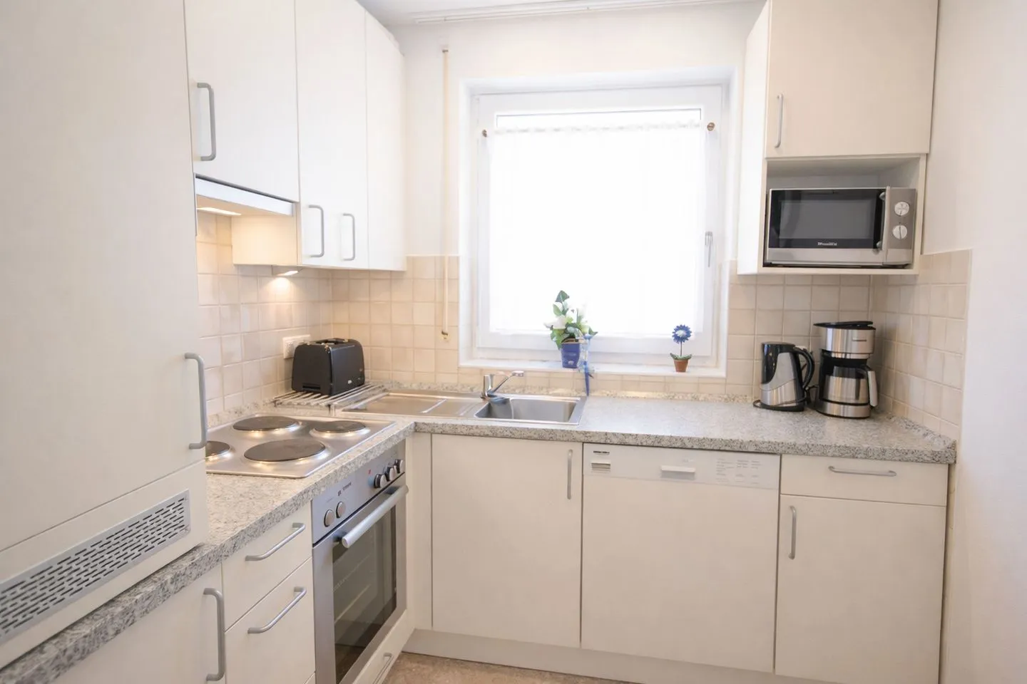 Die separate Küche ist vollständig ausgestattet und lässt keine Wünsche offen: Eine moderne Einbauküche mit Backofen, Geschirrspüler, Kühlschrank mit Gefrierfach, Mikrowelle, Wasserkocher, Toaster und Kaffeemaschine bietet beste Voraussetzungen, um Mahlzeiten ganz nach Ihrem Geschmack zuzubereiten.