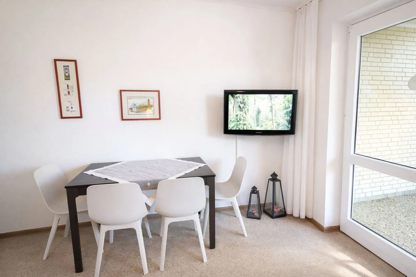 Das angrenzende Wohnzimmer bildet den zentralen Treffpunkt des Hauses und lädt mit einem Flachbildfernseher mit Satellitenanlage sowie einem gemütlichen Esstisch für vier Personen zu gemeinsamen Stunden ein, sei es bei einem entspannten Frühstück oder einem gemütlichen Spieleabend. Von hier aus gelangen Sie direkt auf die Terrasse und in den eingezäunten Garten, der Ihnen zusätzliche Privatsphäre bietet und zum Verweilen im Freien einlädt. Ein praktischer Schuppen steht ebenfalls zur Verfügung und rundet den Komfort im Außenbereich ab.