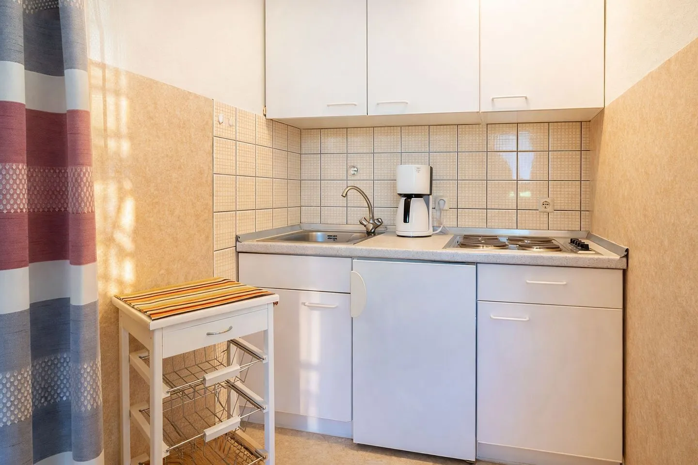 Die gemütlich eingerichtete Ferienwohnung Wolff bietet auf etwa 30 Quadratmetern Wohnfläche ein liebevoll gestaltetes Zuhause auf Zeit und liegt zentral im beliebten Urlaubsort Horumersiel im Fasanenweg. Die Wohnung ist mit viel Sorgfalt und einem Blick fürs Detail eingerichtet und bietet zwei Personen ausreichend Platz für einen entspannten Aufenthalt an der Nordsee. Der offen gestaltete Wohnbereich vereint Wohnen, Schlafen und Kochen auf angenehme Weise und schafft eine behagliche Atmosphäre. Die kleine, im Wohnzimmer integrierte Pantryküche ist funktional ausgestattet und verfügt über ein Kochfeld mit vier Herdplatten, einen Kühlschrank sowie eine Kaffeemaschine, einen Wasserkocher und einen Toaster, sodass einer unkomplizierten Selbstversorgung nichts im Wege steht.