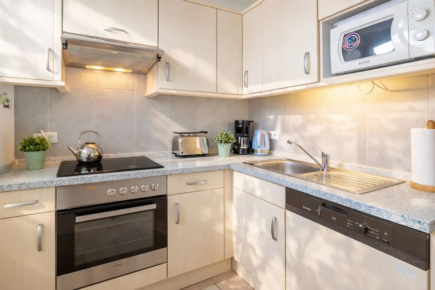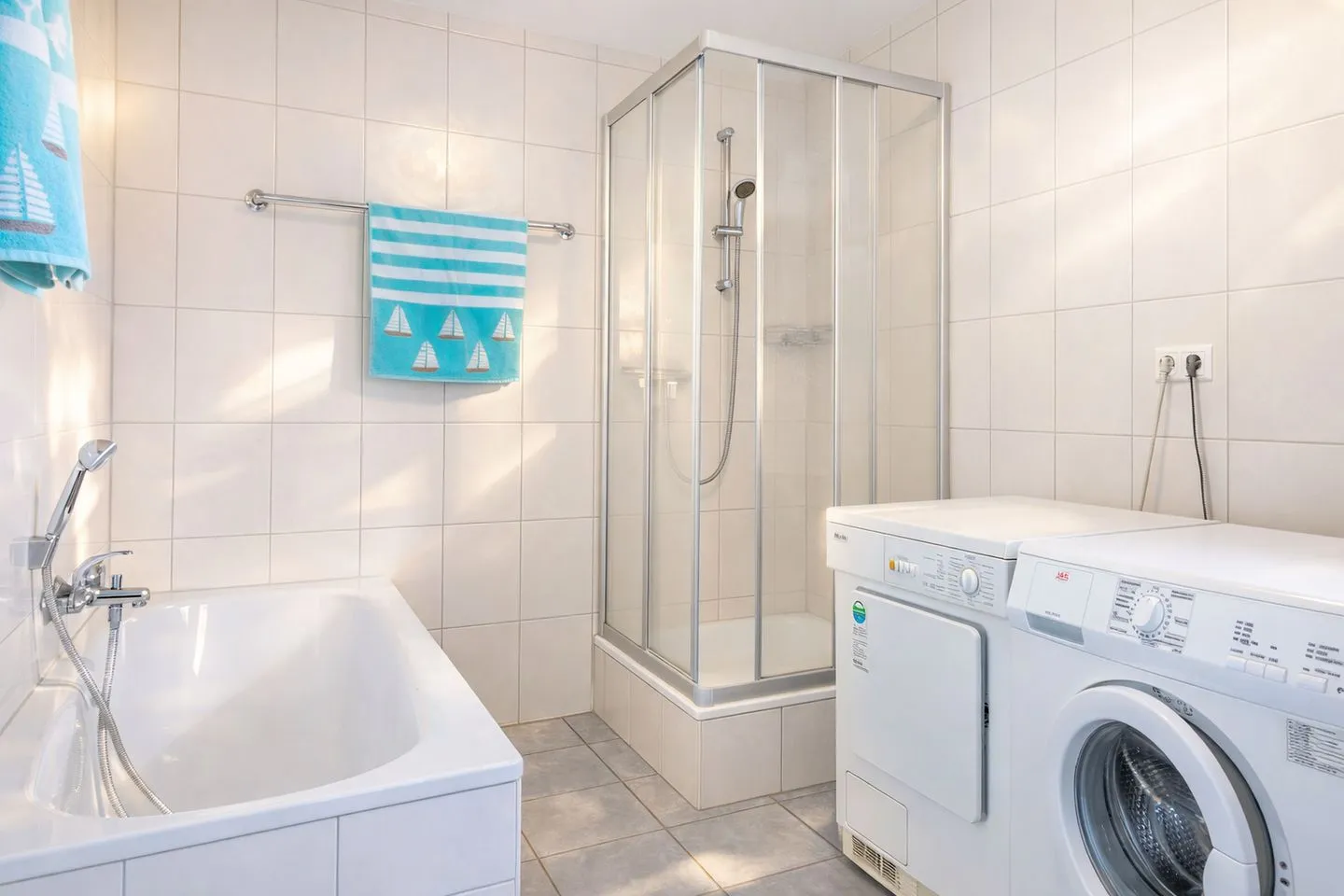 Auf 80 Quadratmetern Wohnfläche bietet sie ideale Voraussetzungen für einen erholsamen Urlaub an der Nordsee, ganz gleich ob als Paar, Familie oder mit vierbeinigem Begleiter. Im Erdgeschoss erwartet Sie ein gemütliches Wohnzimmer mit direktem Zugang zur Terrasse und dem angrenzenden Garten, der gemeinsam mit einer Nachbarwohnung genutzt wird und zu entspannten Stunden im Freien einlädt. Die offen gestaltete Küche mit integriertem Essplatz ist harmonisch in den Wohnbereich eingebunden und vollständig ausgestattet mit Geschirrspüler, Mikrowelle, Backofen, Herd, Kühlschrank mit Gefrierfach, Kaffeemaschine, Toaster und Wasserkocher, sodass Sie sich im Urlaub bequem selbst versorgen können. Ebenfalls im Erdgeschoss befindet sich eines der beiden Badezimmer, das mit Badewanne, Dusche, Waschmaschine und Trockner besonders viel Komfort bietet und auch bei längeren Aufenthalten keine Wünsche offenlässt.