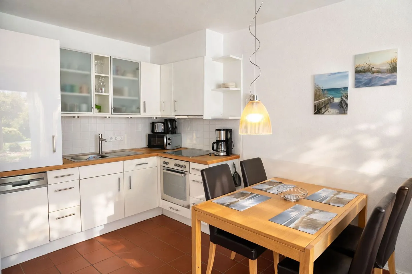 Der offene Wohn- und Essbereich ist lichtdurchflutet und geschmackvoll eingerichtet, sodass Sie sich sofort wie zu Hause fühlen. Die hochwertige Ausstattung und die harmonische Gestaltung schaffen einen Ort, an dem man gern verweilt, gemeinsam isst, lacht oder einfach entspannt. Die voll ausgestattete Küchenzeile lässt keine Wünsche offen und bietet moderne Geräte für genussvolle Urlaubsmomente. Ein Backofen mit Cerankochfeld, Geschirrspüler, Mikrowelle, Kaffeemaschine, Toaster, Wasserkocher sowie ein elektrischer Kontaktgrill stehen Ihnen zur Verfügung und machen die Selbstversorgung im Urlaub angenehm und unkompliziert. Ob ausgedehntes Frühstück, gemeinsames Kochen oder ein gemütlicher Grillabend – hier ist alles vorbereitet.
