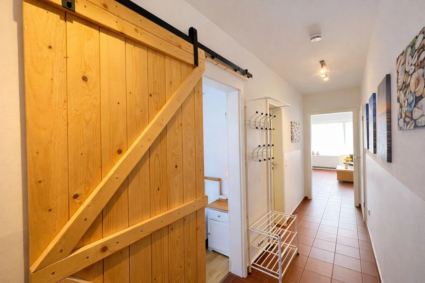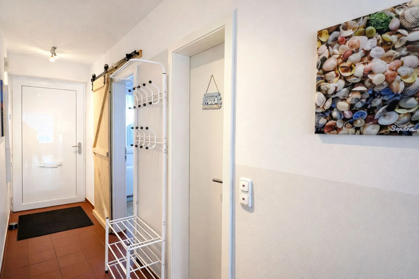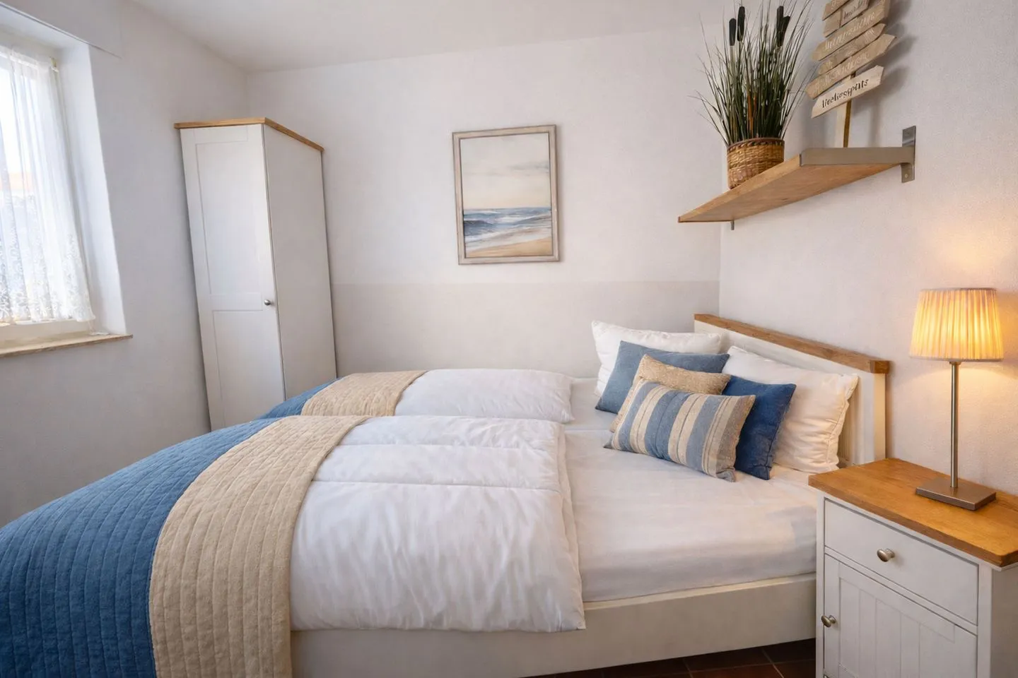 Für erholsamen Schlaf sorgen ein großzügiges Schlafsofa mit den Maßen 1,40 x 2,00 Meter im Wohnbereich sowie ein komfortables Doppelbett mit 1,80 x 2,00 Meter im Schlafzimmer. Dank Rollläden lassen sich alle Räume angenehm verdunkeln, sodass Sie auch nach langen Strandtagen wunderbar zur Ruhe kommen. Vom Wohnzimmer aus treten Sie direkt auf die überdachte Südterrasse, die Ihnen zu jeder Tageszeit einen geschützten Platz an der frischen Nordseeluft bietet. Der Blick in den kleinen, eingezäunten Garten lädt zum Entspannen ein und schafft den perfekten Rahmen für gesellige Grillabende mit dem vorhandenen Kugelgrill. Ein angrenzender Fahrradschuppen bietet zusätzlichen Komfort für aktive Urlauber. Im Flur der sonnigen Wohnung erwartet Sie zudem eine kleine Bilder-Dauerausstellung, die dem Appartement eine ganz persönliche Note verleiht und für zusätzliches Feriengefühl sorgt.