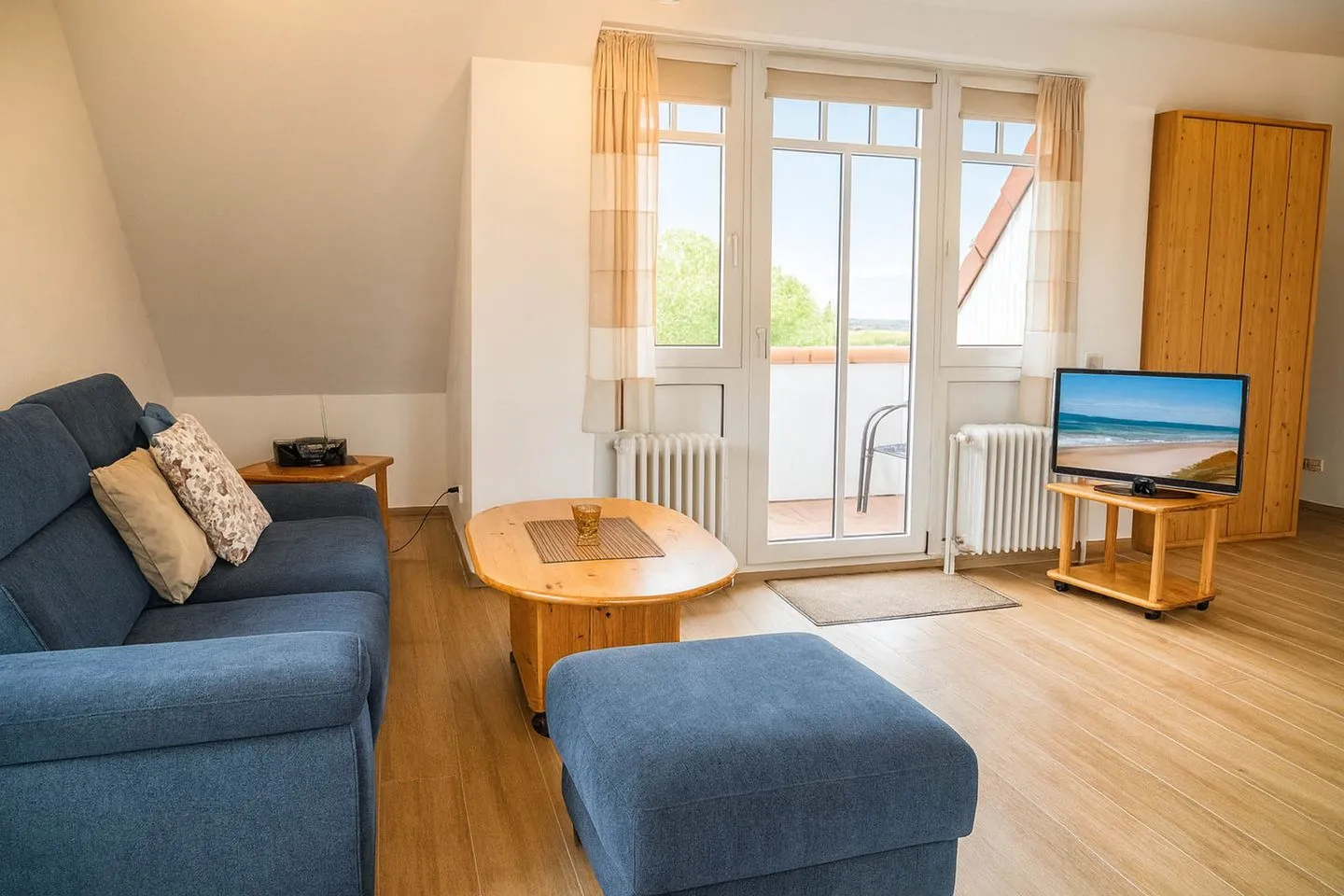Die lichtdurchflutete, liebevoll eingerichtete Maisonettewohnung bietet auf zwei Ebenen perfekten Wohnkomfort für zwei Personen und verbindet zentrale Lage mit wohltuender Ruhe – nur etwa 250 Meter vom großen Sandstrand entfernt. Das Apartment befindet sich im zweiten Obergeschoss am Ende eines Laubengangs und empfängt Sie im unteren Bereich mit einem großzügigen Wohnraum, der durch ein gemütliches Sofa und eine moderne, vollständig ausgestattete Küche besticht. Hier stehen Ihnen ein Cerankochfeld, Backofen, Geschirrspüler, Kühlschrank mit Gefrierfach, Toaster, Wasserkocher und Kaffeemaschine zur Verfügung. Der angrenzende Essbereich lädt zu entspannten Mahlzeiten ein, während der Balkon direkt vom Wohnbereich aus erreichbar ist und den idealen Platz bietet, um den Tag in angenehmer Atmosphäre ausklingen zu lassen. Ein helles Tageslichtbad mit Dusche und WC rundet das Angebot auf dieser Ebene ab. Über eine Treppe gelangen Sie in den separaten Schlafbereich der oberen Etage, wo ein komfortables Doppelbett für erholsame Nächte sorgt. Ein eigener PKW-Stellplatz am Haus steht Ihnen ebenfalls zur Verfügung.