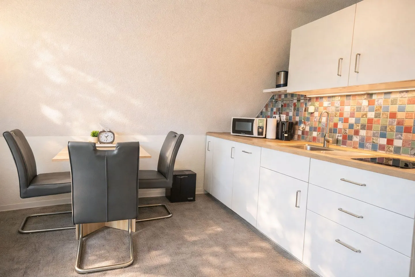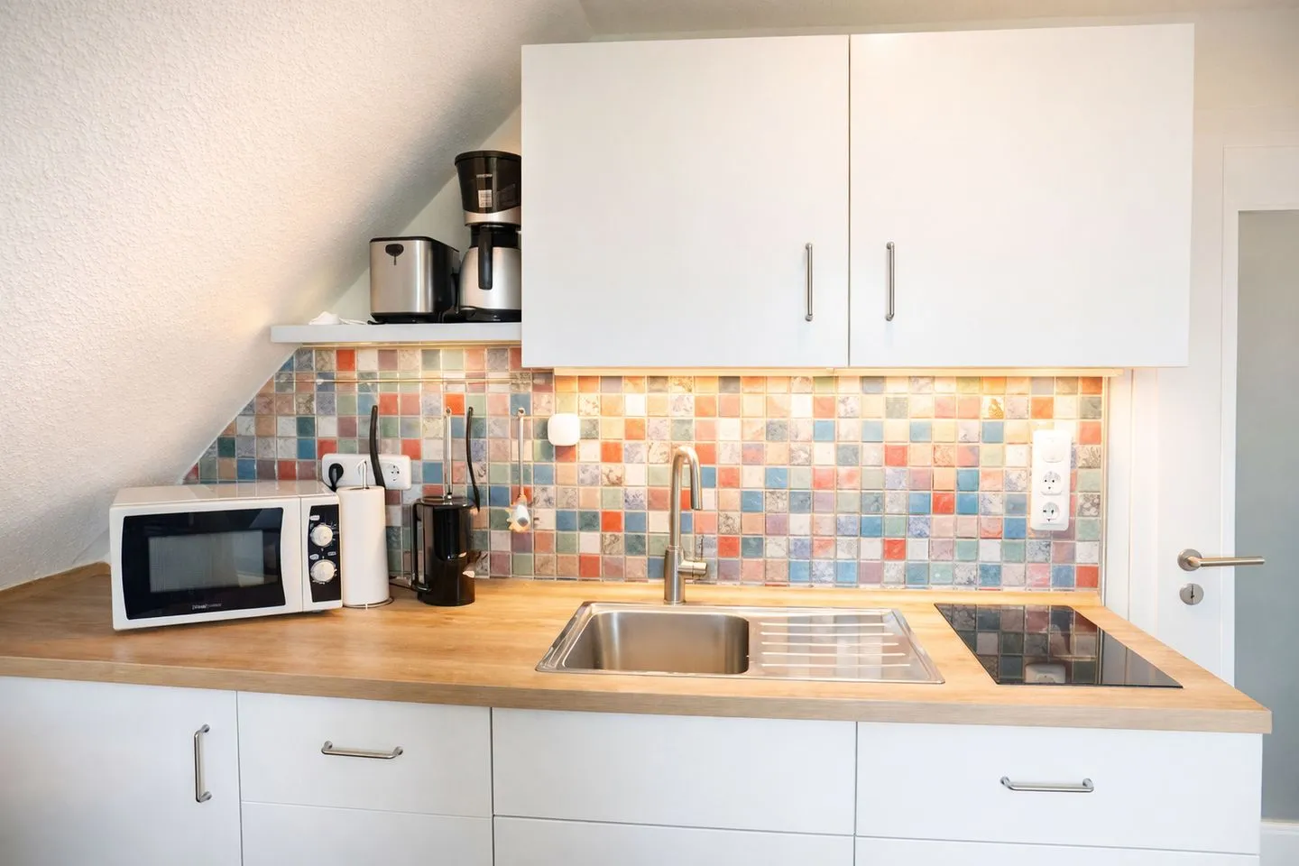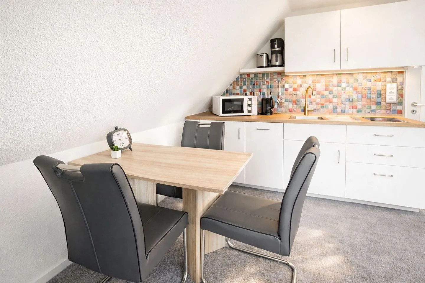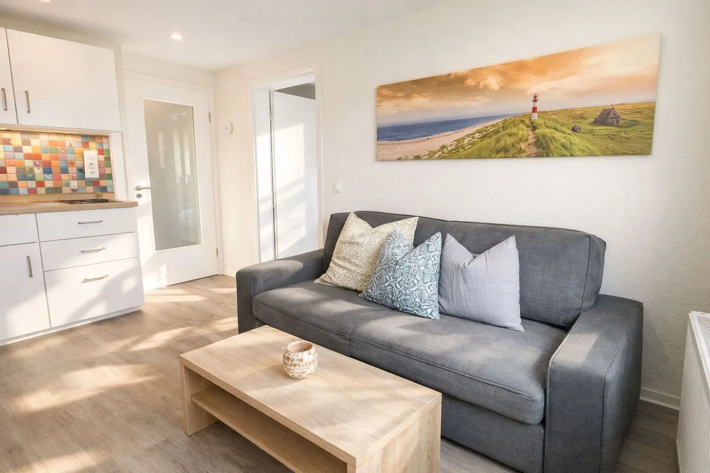 Das Ferienappartement Baltrum bietet auf rund 40 Quadratmetern alles, was Sie für einen entspannten Aufenthalt benötigen. Die Wohnung befindet sich im Obergeschoss eines gepflegten Mehrfamilienhauses, dem charmanten Alten Fischerhaus, und ist mit viel Liebe zum Detail eingerichtet. Sie eignet sich ideal für bis zu drei Personen und überzeugt durch ihre gemütliche, helle Atmosphäre. Die bequeme Couch lädt tagsüber zum Lesen, Entspannen oder Träumen ein und lässt sich am Abend mit wenigen Handgriffen in ein komfortables Bett mit einer Liegefläche von 140 x 200 Zentimetern verwandeln, auf dem man auch problemlos mehrere Nächte angenehm schlafen kann. Die kompakte, aber durchdacht ausgestattete Küchenzeile verfügt über ein modernes 2er-Induktions-Ceranfeld, einen Geschirrspüler, eine Kaffeemaschine, einen Wasserkocher sowie einen freistehenden Kühlschrank mit Gefrierfach, sodass Sie sich jederzeit bequem selbst versorgen können. Für Unterhaltung sorgen ein 32-Zoll-Flachbildfernseher mit integriertem SAT-Receiver und DVD-Player, ein kleines Radio sowie kostenfreies WLAN, damit Sie auch im Urlaub bestens vernetzt bist.