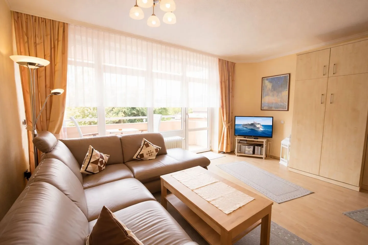 Schon beim Betreten empfängt Sie eine helle, freundliche Atmosphäre, die sofort Urlaubsstimmung aufkommen lässt. Das großzügige Wohnzimmer bietet ein gemütliches Ecksofa zum Entspannen, einen modernen Flachbildfernseher sowie einen einladenden Essplatz für gemeinsame Mahlzeiten. Von hier aus gelangen Sie direkt auf den Balkon, auf dem Sie frische Meeresluft genießen und den Tag entspannt ausklingen lassen können. Zusätzlich steht im Wohnbereich ein praktisches Schrankbett zur Verfügung, das bei Bedarf weiteren Schlafkomfort bietet.