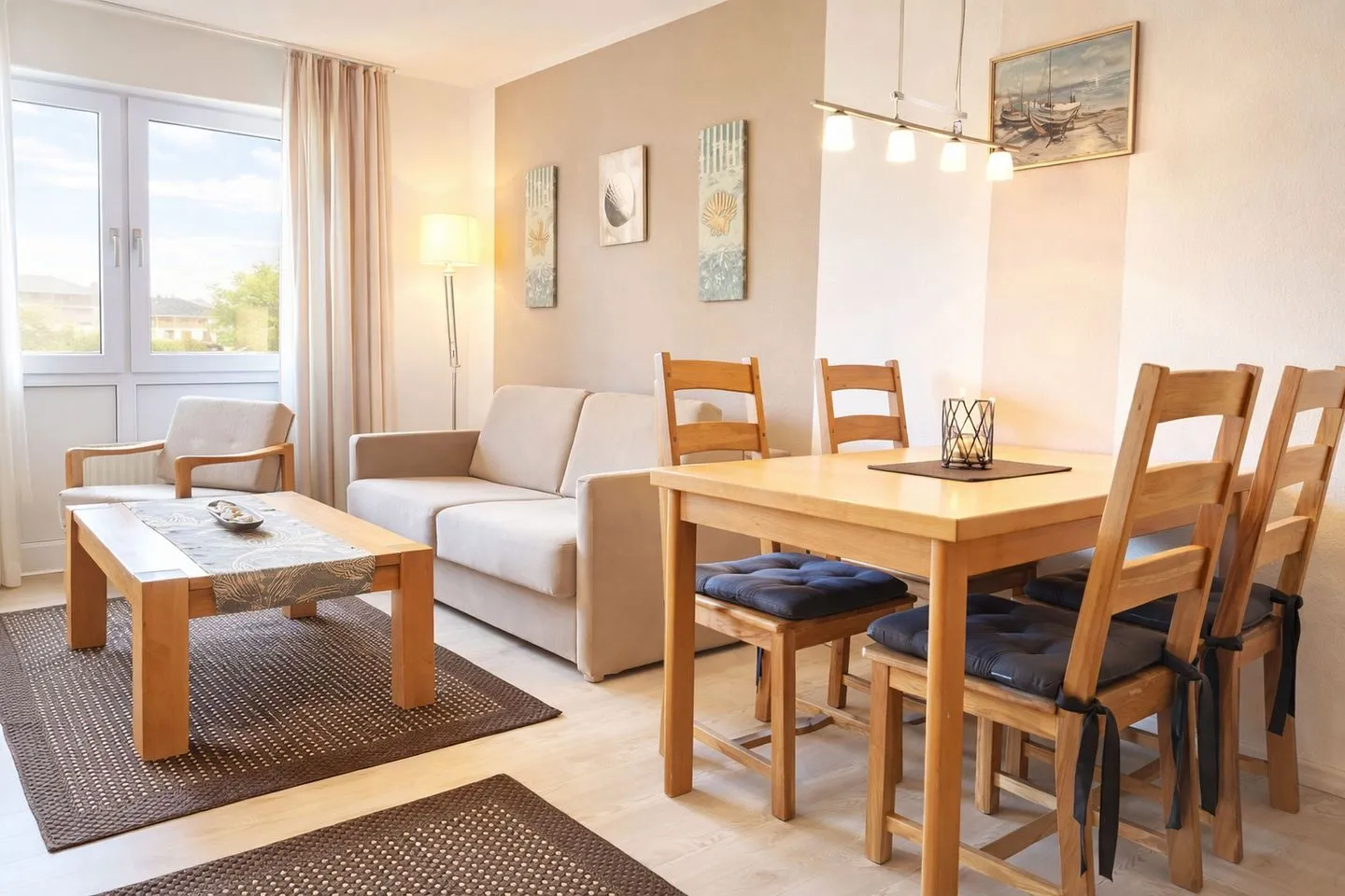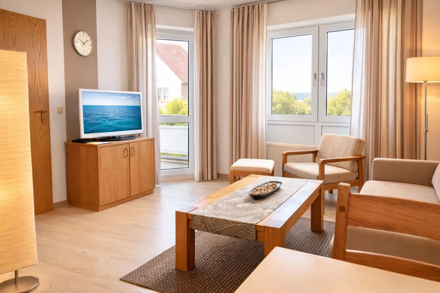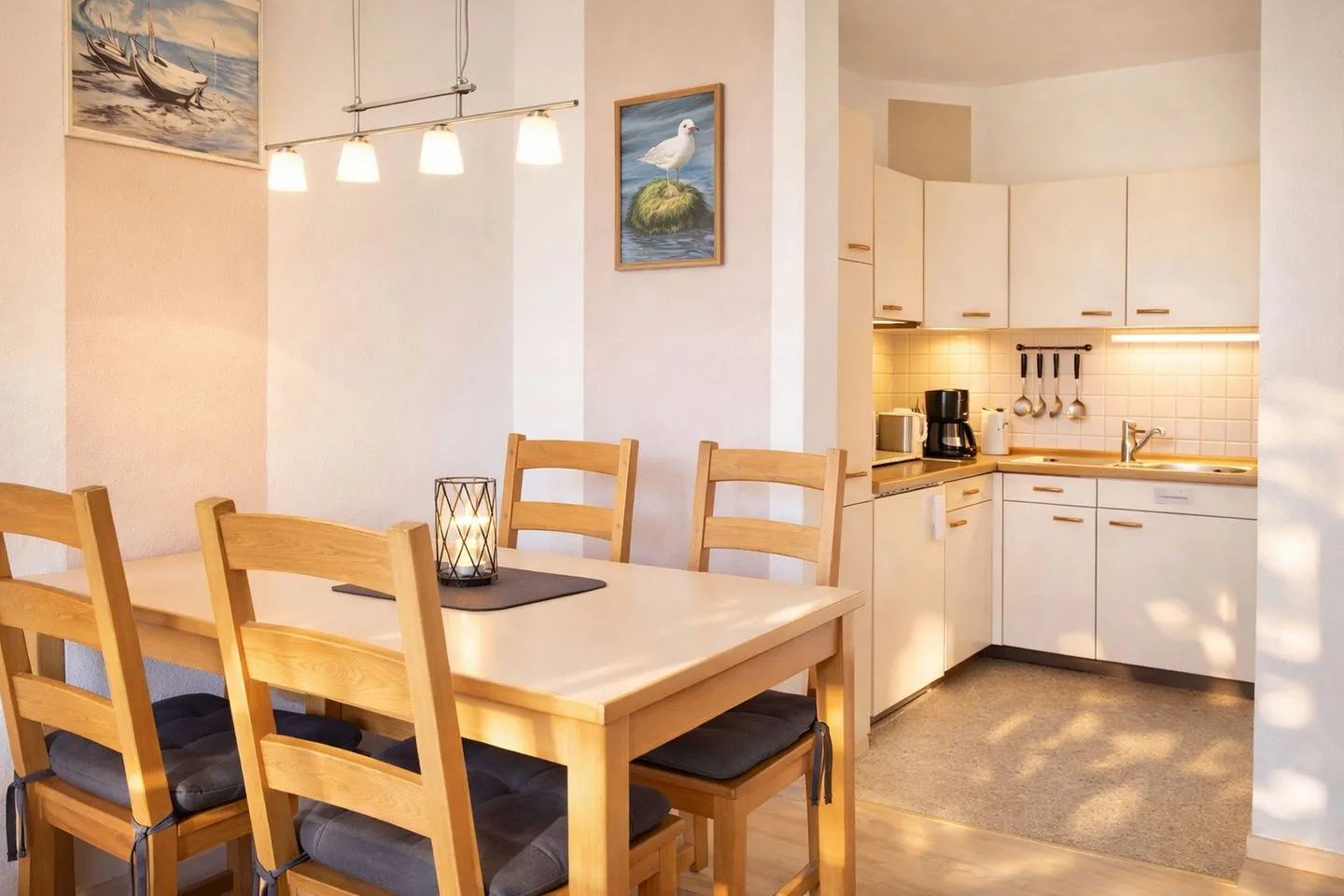 Die liebevoll eingerichtete Wohnung verfügt über ein separates Schlafzimmer mit zwei gemütlichen Einzelbetten und bietet im hellen Wohnbereich zusätzlich ein komfortables Schlafsofa, sodass auch eine weitere Person bequem Platz findet. Die funktionale und zugleich gut ausgestattete Küchenzeile lädt dazu ein, den Tag ganz nach den eigenen Wünschen zu gestalten. Mit Kaffeemaschine, Vier-Platten-Cerankochfeld, Mikrowelle, Kühlschrank mit Gefrierfach, Wasserkocher und Toaster ist alles vorhanden, um vom schnellen Frühstück bis zum entspannten Abendessen bestens versorgt zu sein. Besonders schön ist der Zugang vom Wohnbereich auf den Balkon, der zu jeder Tageszeit ein beliebter Ort ist, um bei einem Frühstück den Morgen zu begrüßen oder bei einem Glas Wein den Abend gemütlich ausklingen zu lassen.
