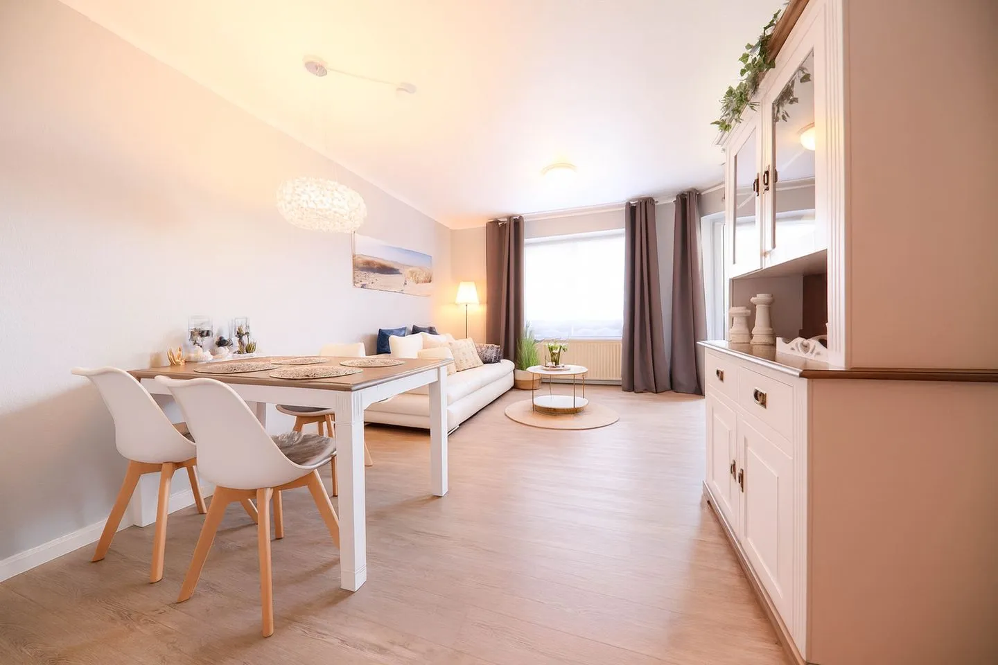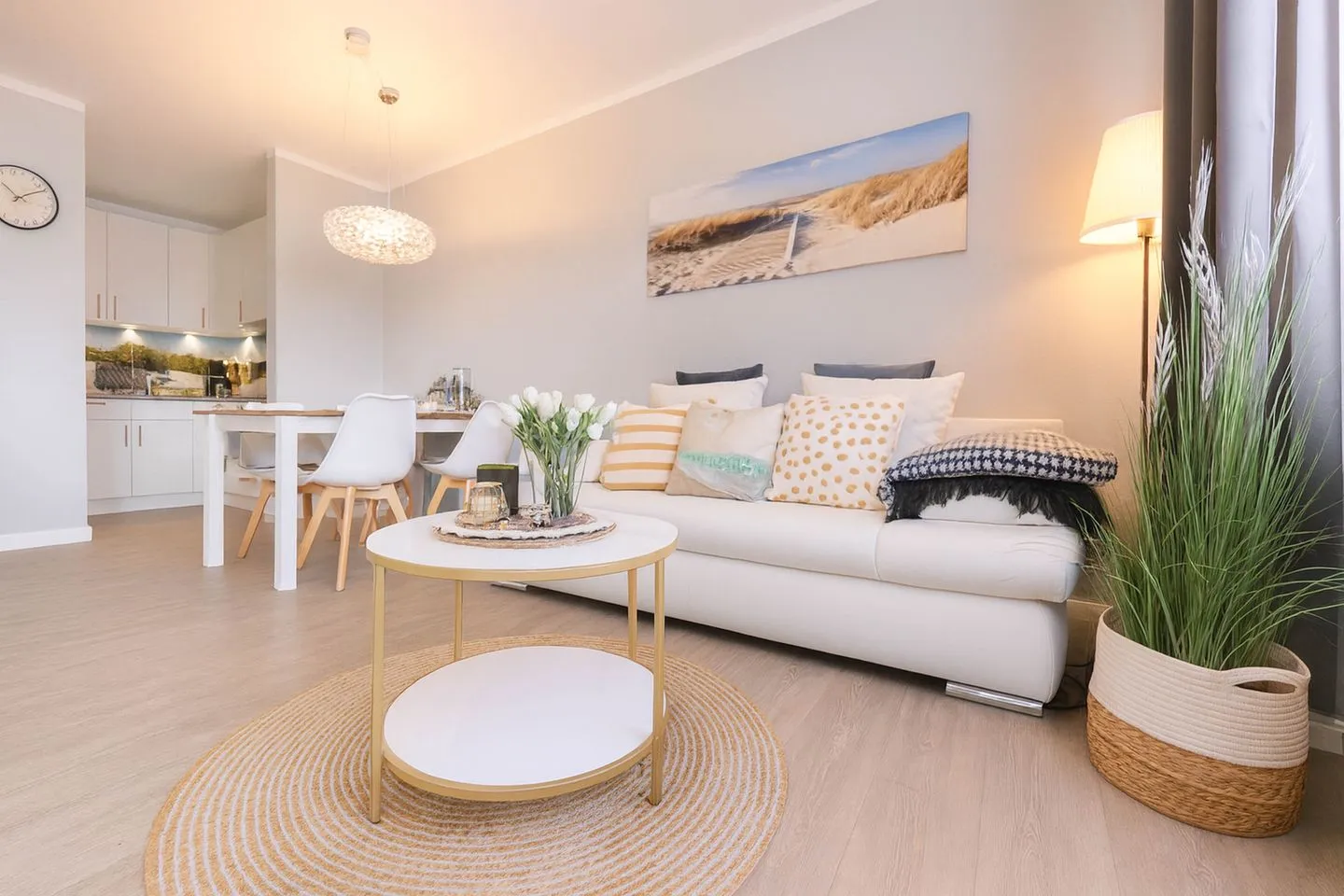Die moderne Küchenzeile ist vollständig ausgestattet und lässt keine Wünsche offen. Sie verfügt über eine Geschirrspülmaschine, eine Mikrowelle, einen Herd, einen Kühlschrank mit Gefrierfach sowie einen Wasserkocher und einen Toaster. Ein hochwertiger Kaffeevollautomat der Marke De’Longhi sorgt für genussvolle Kaffeemomente zu jeder Tageszeit. Der helle Wohnbereich lädt zum Entspannen ein und bietet einen direkten Zugang zum Balkon, auf dem Sie morgens bei frischer Meeresluft entspannt frühstücken oder den Tag ausklingen lassen können.