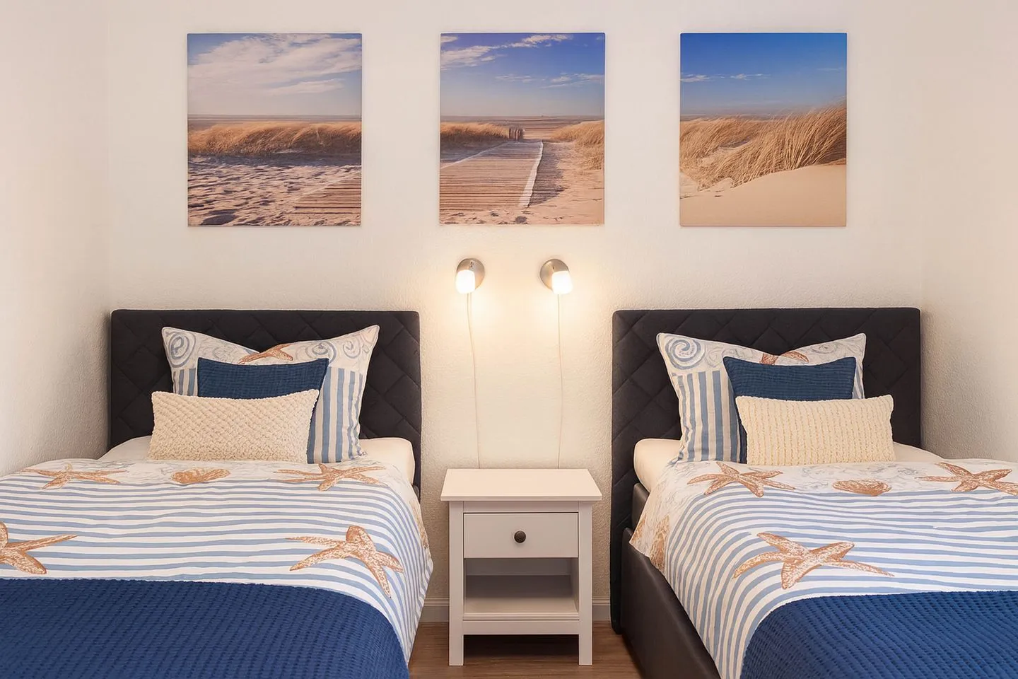 Die Ferienwohnung Chillig im Hus Jadekieker besticht durch ihre außergewöhnliche Lage direkt am Strand von Schillig und bietet ideale Voraussetzungen für einen entspannten Urlaub an der Nordsee. Hier genießen Sie die unmittelbare Nähe zum Meer und können den Strand in wenigen Schritten erreichen. Die Wohnung verfügt über ein gemütliches Schlafzimmer mit komfortablen Boxspring-Einzelbetten, die für erholsamen Schlaf sorgen. Im Wohnbereich befindet sich zusätzlich ein Schlafsofa, das eine weitere Schlafmöglichkeit für eine Person bietet und die Ferienwohnung auch für kleine Familien oder zusätzliche Gäste geeignet macht.
