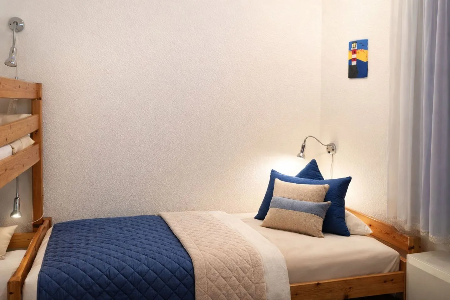 Die Küche ist bestens ausgestattet und lässt keine Wünsche offen. Geschirrspülmaschine, Mikrowelle, Cerankochfeld mit Backofen, Waschmaschine, Kaffeemaschine, Wasserkocher und Toaster sorgen dafür, dass Sie sich im Urlaub ganz flexibel selbst versorgen können. Ob gemeinsames Frühstück oder gemütliches Abendessen – hier macht Kochen Freude. Das Kinderzimmer ist mit einem Etagenbett sowie einem zusätzlichen Einzelbett eingerichtet und bietet ausreichend Platz für kleine und größere Gäste. Auch an die jüngsten Urlauber ist gedacht: Ein Reisebett und ein Hochstuhl stehen selbstverständlich bereit.