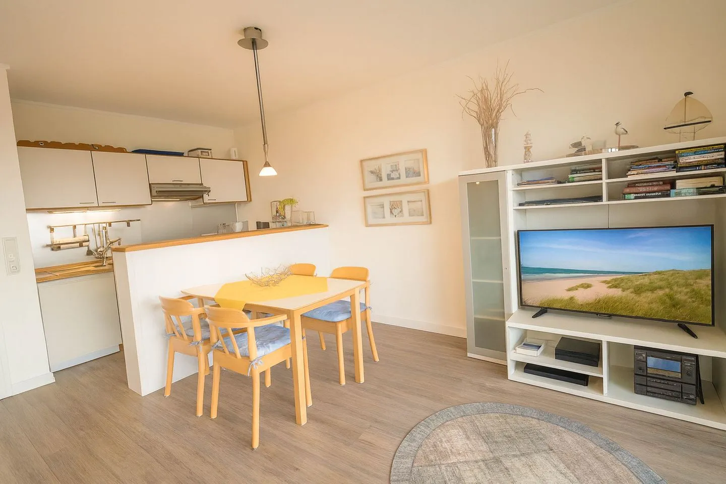 Die im Wohnbereich integrierte, optisch durch einen Tresen abgetrennte Küchenzeile ist kompakt und zugleich vollständig ausgestattet. Backofen, Geschirrspülmaschine, Kaffeemaschine, Toaster, Wasserkocher, ein 4-Platten-Herd sowie eine Kühl-Gefrierkombination stehen Ihnen zur Verfügung und ermöglichen eine komfortable Selbstversorgung. Der angrenzende Essbereich bietet den idealen Platz für gemeinsame Mahlzeiten oder ein gemütliches Frühstück vor einem erlebnisreichen Tag am Meer.