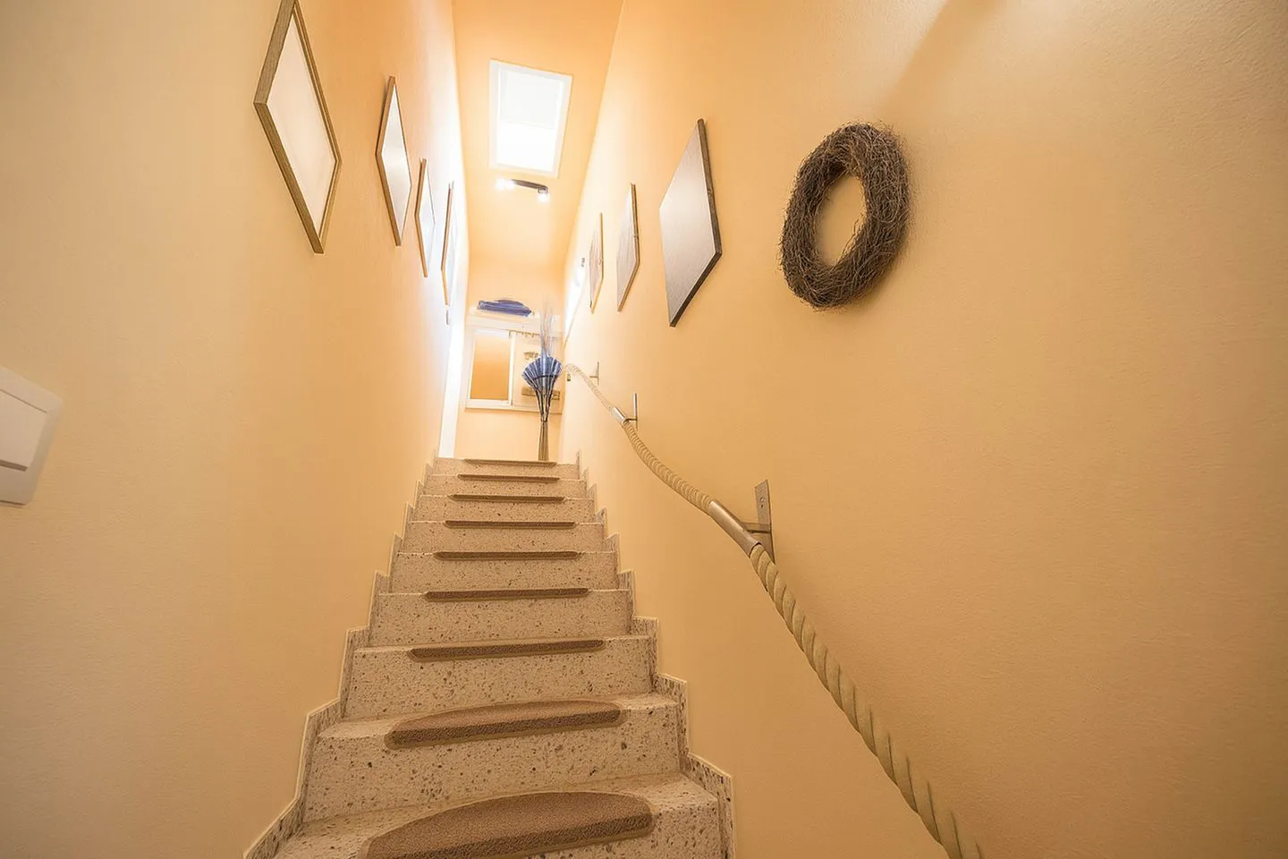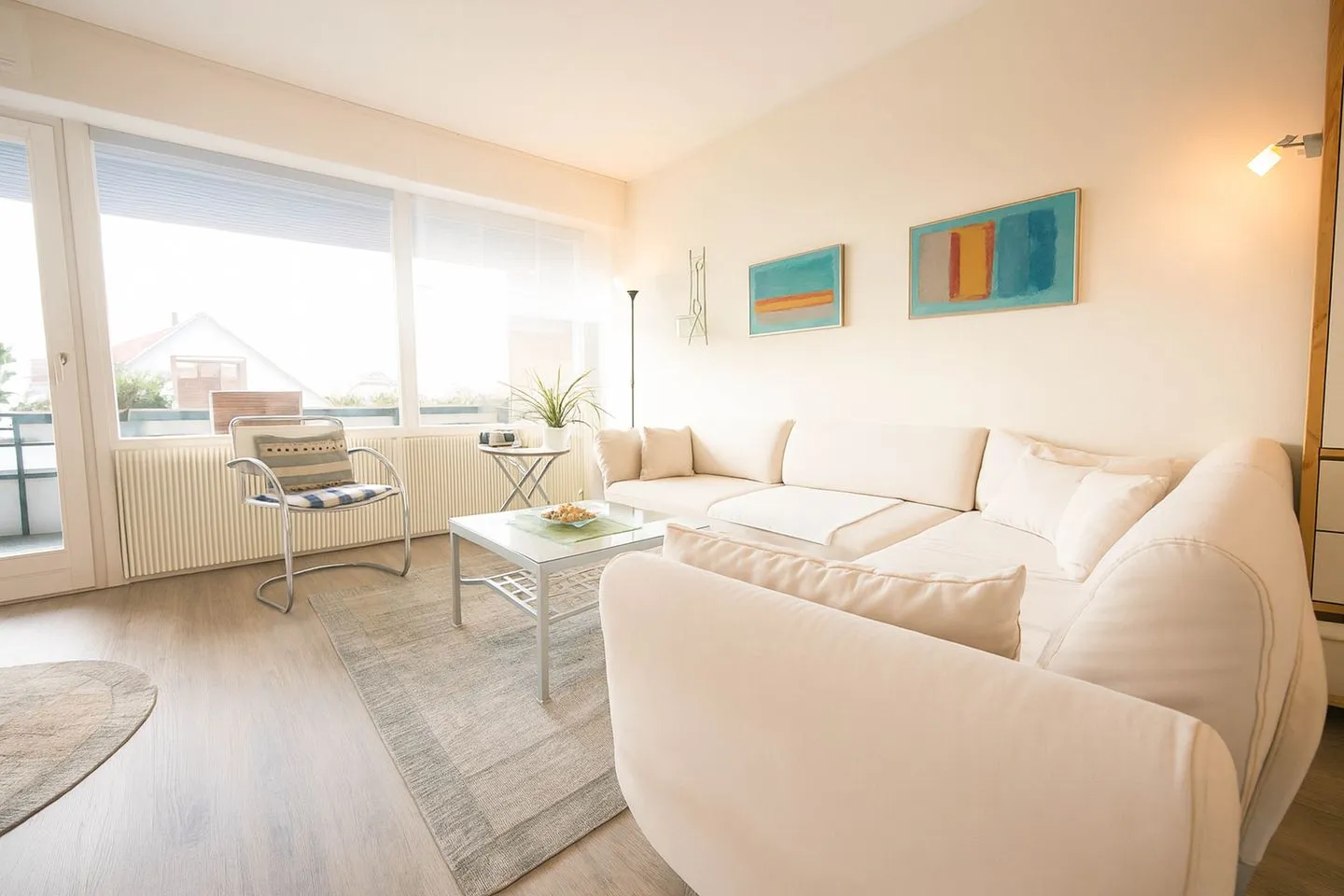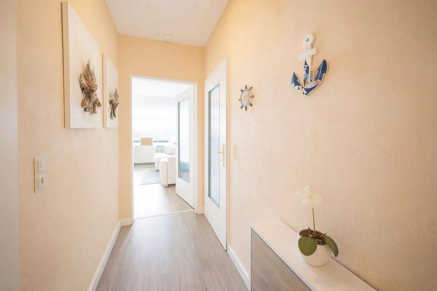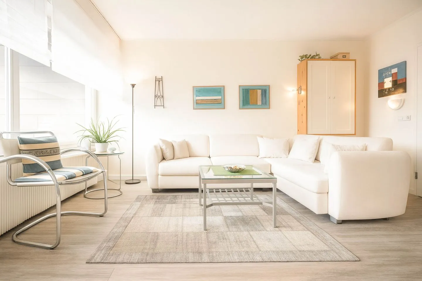 Auf rund 50 Quadratmetern Wohnfläche im ersten Obergeschoss eines gepflegten Reihenhauses erwartet Sie eine helle und freundliche Atmosphäre, die sofort Urlaubsstimmung aufkommen lässt. Ein separater Eingang sorgt für zusätzliche Privatsphäre und ein angenehmes Ankommen. Das Wohnzimmer ist geschmackvoll gestaltet und lädt mit seiner gemütlichen Einrichtung zum Verweilen ein. Ein moderner 43-Zoll-Sat-TV, Radio und CD-Player sorgen für Unterhaltung, während eine kleine Auswahl an Strandlektüre und Gesellschaftsspielen für abwechslungsreiche und entspannte Stunden bereitliegt.