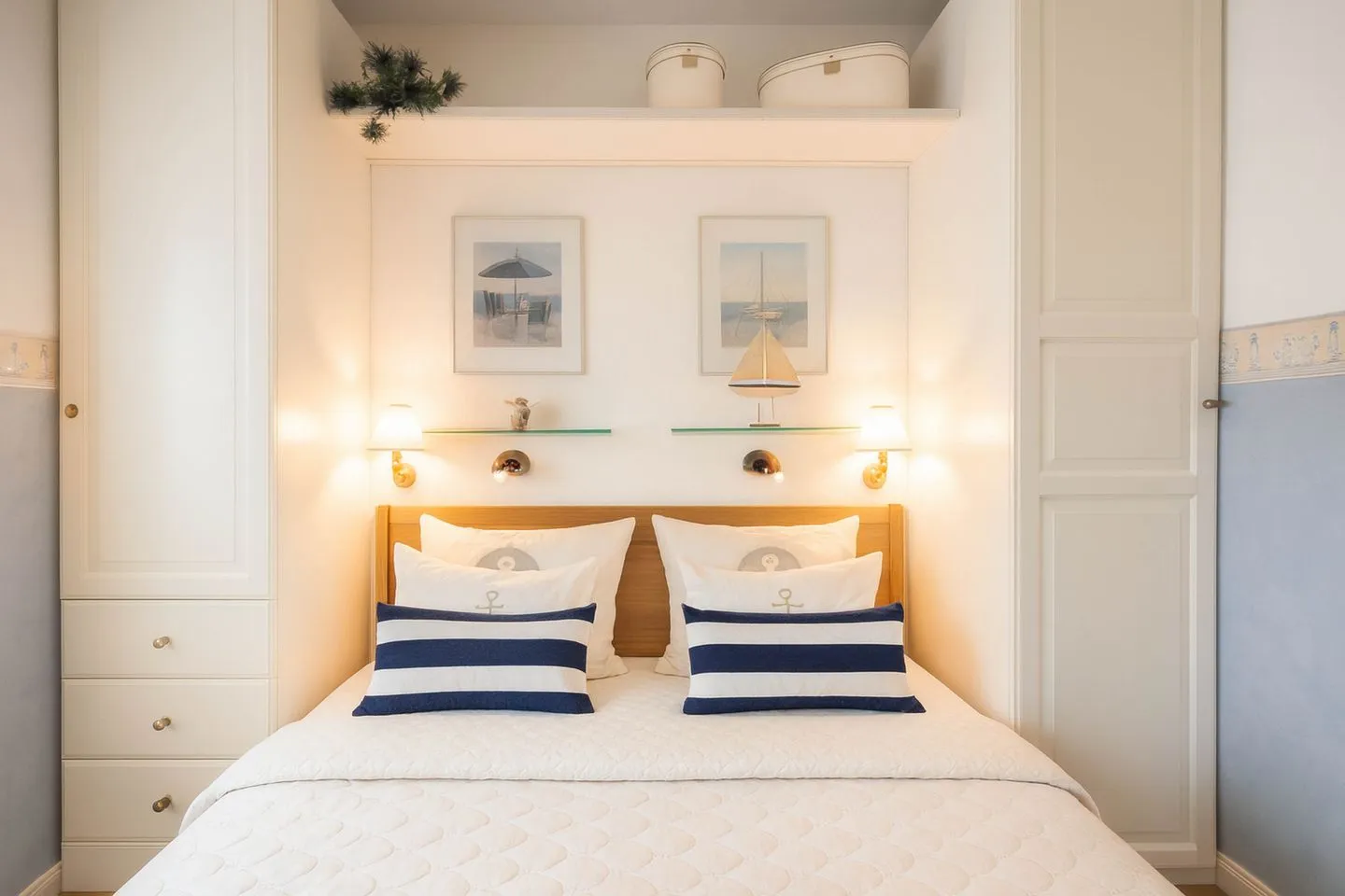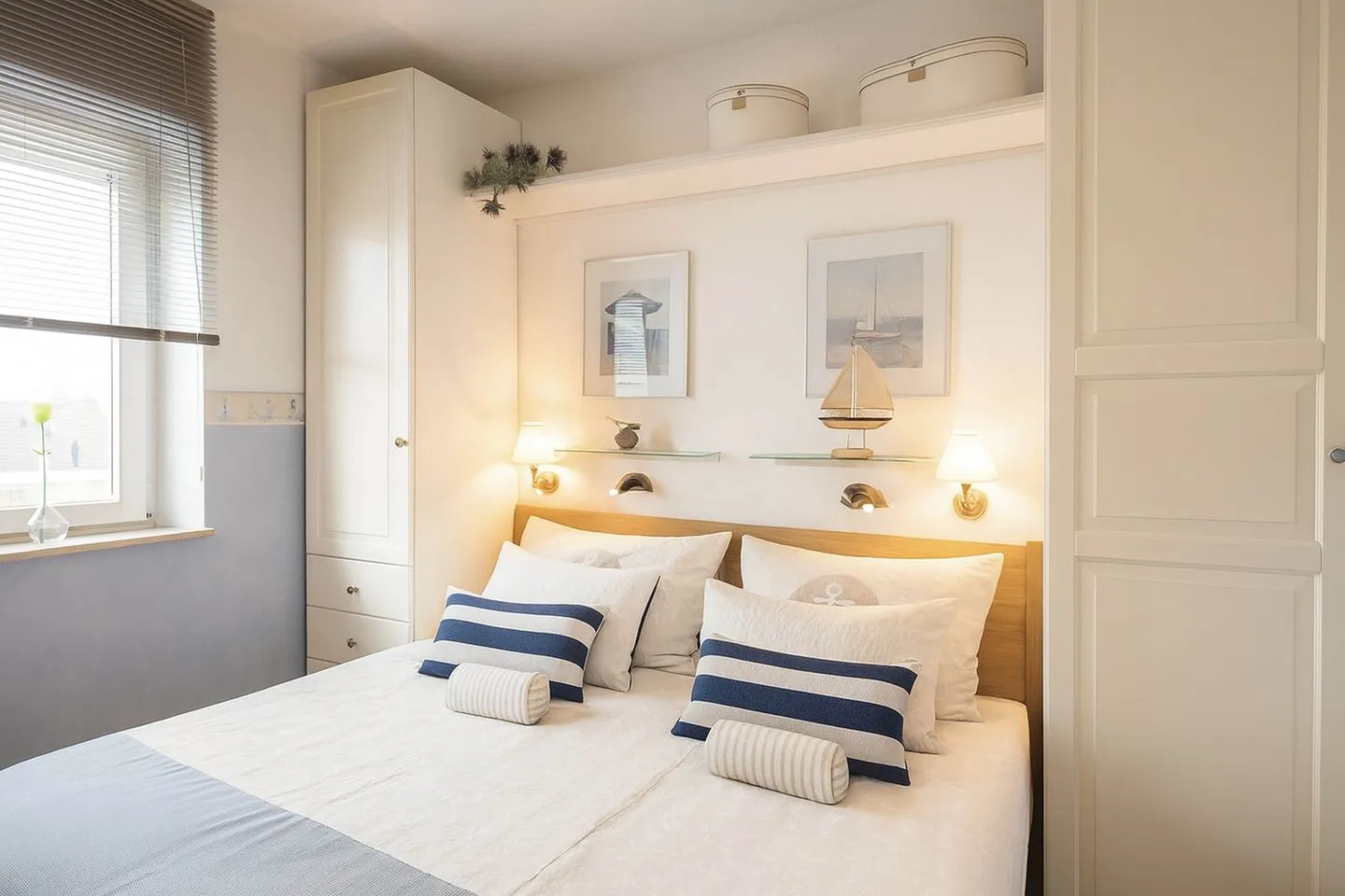 Ein besonderes Highlight der Ferienwohnung Meggy ist der große, überdachte Balkon in Süd-West-Ausrichtung. Hier können Sie selbst in den Abendstunden noch die warmen Sonnenstrahlen genießen und den Tag ausklingen lassen. Das helle Badezimmer ist mit einer Dusche, Waschbecken und WC ausgestattet, ein Fön steht ebenfalls für Sie bereit. Das maritime Schlafzimmer lädt mit seinem komfortablen Doppelbett in der Größe 1,80 x 2,00 Meter zum Träumen ein. Zwei Matratzen sorgen für angenehmen Schlafkomfort, während zwei Schränke, eine Kommode und ein zusätzlicher Einbauschrank ausreichend Stauraum bieten. Außenrollos ermöglichen eine vollständige Verdunkelung und garantieren erholsame Nächte.