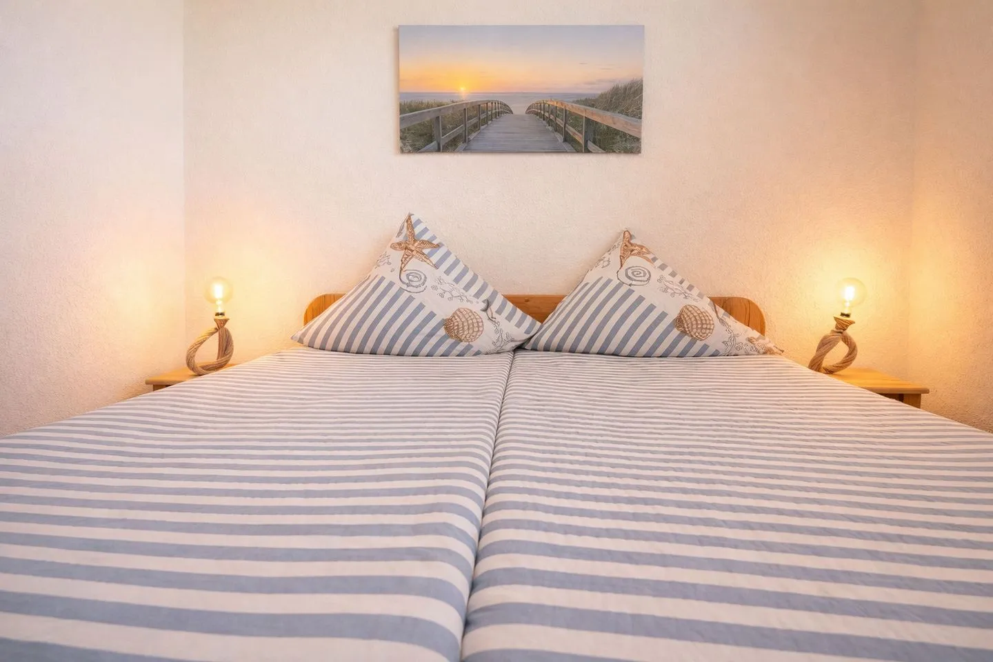 Der Grundriss der Wohnung ist durchdacht und komfortabel gestaltet. Von der Haustür aus gelangen Sie über den Windfang direkt ins Schlafzimmer, das mit einem großzügigen Doppelbett ausgestattet ist und dank hochwertiger Matratzen für erholsamen Schlaf sorgt. Über einen kleinen Durchgang mit Kleiderschrank erreichen Sie das innenliegende Badezimmer, dessen besonderes Highlight die moderne Regenwalddusche ist – ideal, um nach einem Strandtag neue Energie zu tanken. An den Durchgang schließt sich die L-förmig angelegte Küchenzeile im offenen Wohnbereich an. Diese ist umfassend ausgestattet und bietet unter anderem einen Backofen, eine Dunstabzugshaube, 4 Kochplatten, eine Mikrowelle, einen Toaster und einen Wasserkocher, sodass Sie sich im Urlaub ganz flexibel selbst versorgen können.
