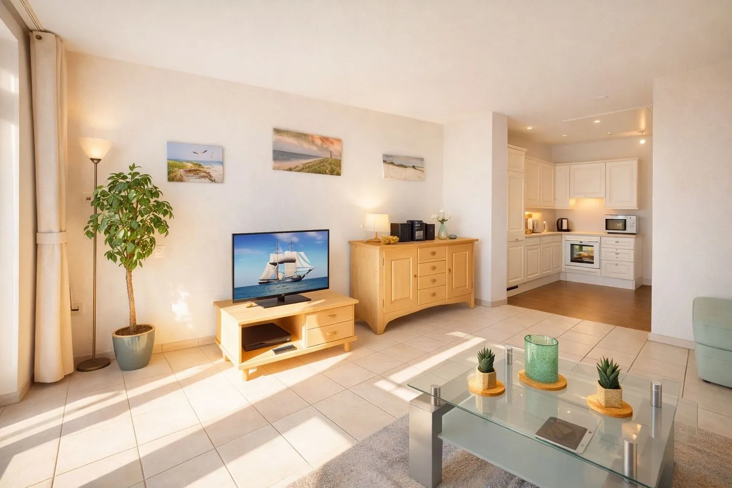 Das helle, lichtdurchflutete Wohnzimmer bildet das Herzstück der Wohnung und überzeugt durch seine freundliche und offene Gestaltung. Von hier aus gelangen Sie direkt auf den Balkon mit Südausrichtung, der zu entspannten Stunden an der frischen Nordseeluft einlädt. Ob beim ersten Kaffee am Morgen oder beim Ausklang eines erlebnisreichen Tages – hier genießen Sie Sonne, Ruhe und Urlaubsfeeling pur. Nur wenige Gehminuten trennen Sie von der Haustür über den Deich bis hin zum Meer, dessen Nähe man nicht nur hört und riecht, sondern sogar vom Schlafzimmer aus sehen kann.