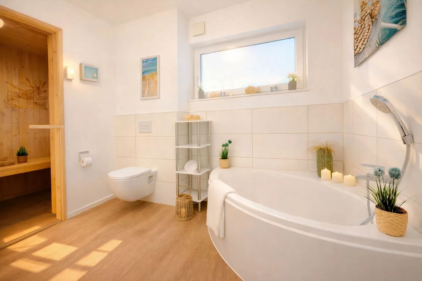 Ein besonderes Highlight der Ferienwohnung ist das großzügige Badezimmer, das mit integrierter Sauna, ebenerdiger Regendusche und großer Eckbadewanne bei jedem Wetter pure Entspannung verspricht. Hier wird aus jedem Tag ein kleiner Wellnesstag für Körper und Seele. Zusätzlich sorgt die Fußbodenheizung in der gesamten Wohnung für ein angenehm warmes Wohngefühl – besonders wohltuend nach einem ausgedehnten Spaziergang am Meer.