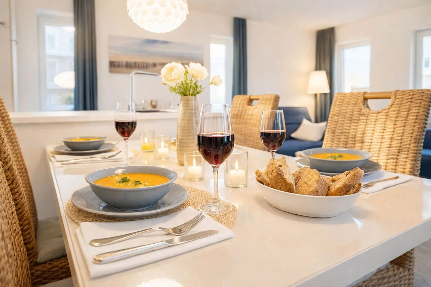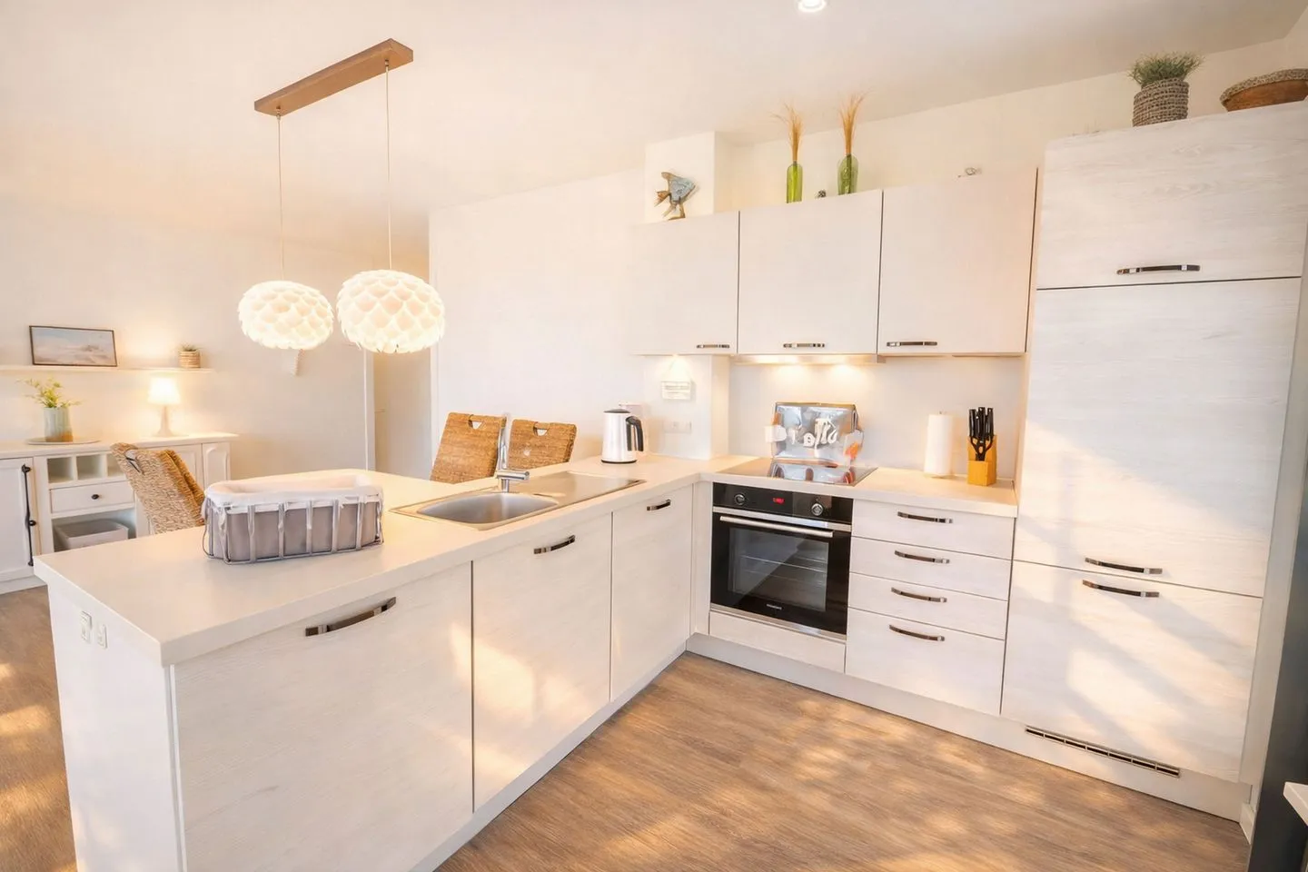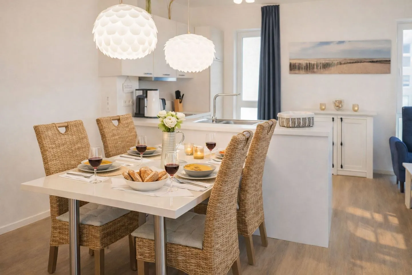 Direkt hinter dem Deich empfängt Sie die lichtdurchflutete Neubau-Ferienwohnung Leuchtfeuer – ein Ort, an dem modernes Design, hochwertiger Komfort und die besondere Atmosphäre der Nordsee zu einem rundum entspannten Urlaubserlebnis verschmelzen. Schon beim Eintreten spüren Sie die großzügige Raumwirkung und die klare, zeitlos schöne Gestaltung, die auf vier Personen ausgelegt ist und sowohl Paaren als auch Familien ein behagliches Zuhause auf Zeit bietet. Der offene Wohnbereich mit gemütlicher Sitzecke und Essplatz lädt zum Ankommen und Durchatmen ein, während die elegant integrierte Küche mit vollständiger Ausstattung vom ersten Frühstück bis zum entspannten Abendessen keine Wünsche offenlässt. Geschirr, Besteck, Gläser sowie Töpfe und Pfannen stehen selbstverständlich bereit, sodass Sie sich ganz auf Genuss und Erholung konzentrieren können.