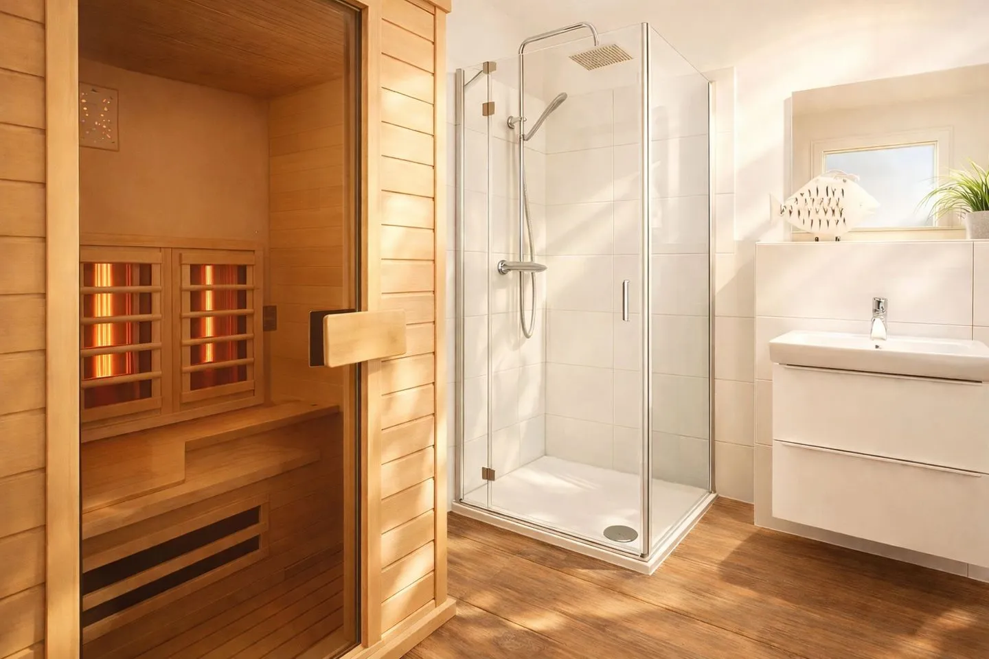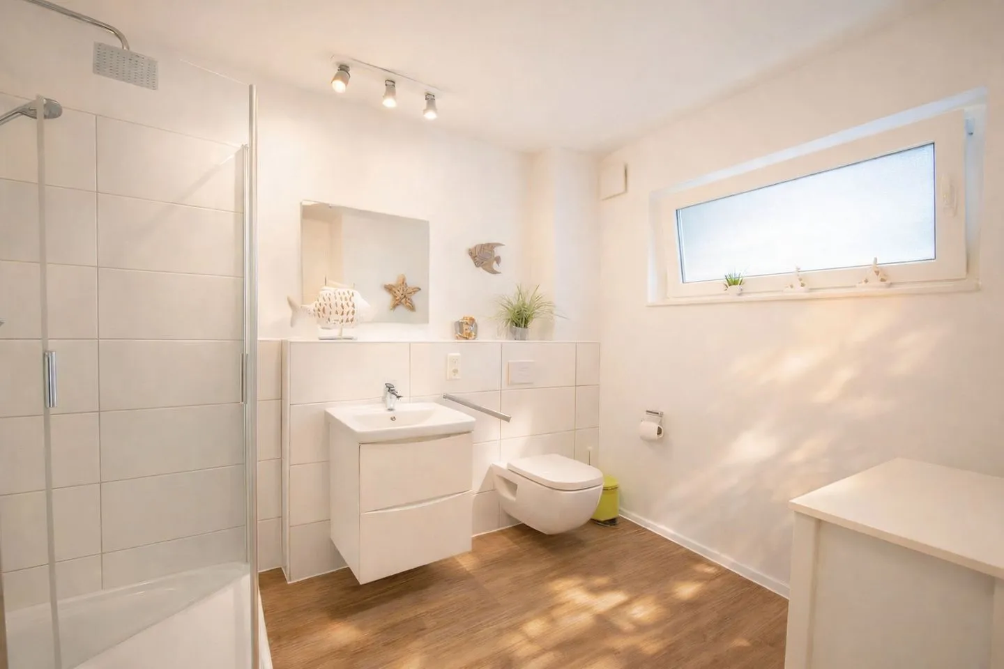 Ein echtes Highlight der Wohnung ist das großzügig geschnittene Badezimmer, das als kleine Wellnessoase gestaltet ist. Die moderne Dusche und die integrierte Infrarotkabine laden dazu ein, bei jedem Wetter zu entspannen und die Seele baumeln zu lassen. Nach einem langen Strandspaziergang oder einem aktiven Urlaubstag finden Sie hier den perfekten Ort zum Abschalten und Regenerieren. Ergänzt wird das Wohnkonzept durch einen großzügigen, möblierten und überdachten Balkon, der zum Verweilen einlädt und Ihnen auch an kühleren oder windigeren Tagen einen geschützten Platz an der frischen Luft bietet.