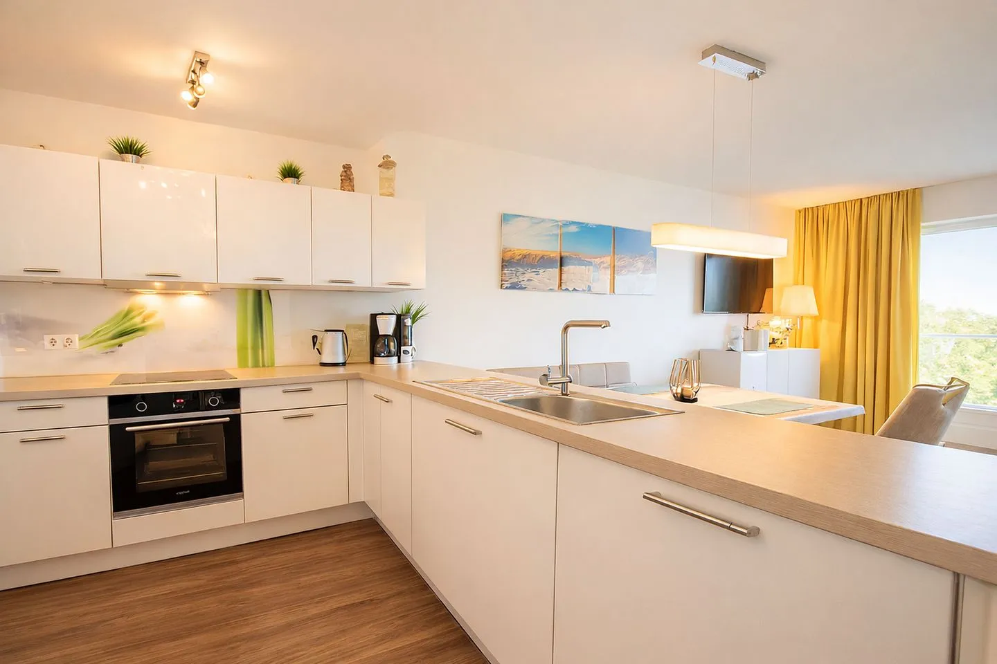 In dieser modernen und großzügig geschnittenen Ferienwohnung erwartet Sie ein stilvolles Zuhause auf Zeit, das Gemütlichkeit und hohen Anspruch harmonisch miteinander verbindet. Schon beim Betreten spüren Sie die helle, freundliche Atmosphäre des offen gestalteten Wohnbereichs, der mit einem komfortablen Schlafsofa, einem Couchtisch und zwei bequemen Sesseln zum Entspannen einlädt. Dank des Schlafsofas eignet sich die Wohnung ideal für einen Aufenthalt mit bis zu vier Personen und bietet ausreichend Platz für gemeinsame Urlaubstage. Ein Fernseher mit Satellitenempfang sorgt für Unterhaltung und gemütliche Abende, ganz gleich, ob nach einem erlebnisreichen Tag oder bei nordischem Schietwetter.
