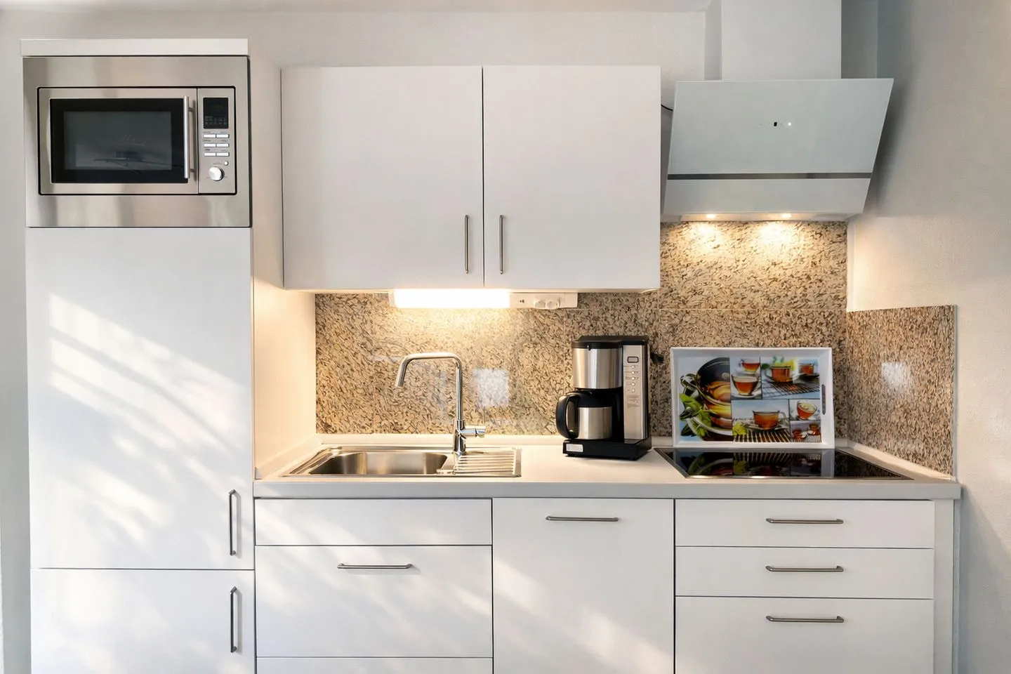 Die ebenerdige Ferienwohnung Strandmuschel präsentiert sich hell, modern und freundlich eingerichtet und bietet zwei Personen einen komfortablen und entspannten Rahmen für einen erholsamen Urlaub an der Nordsee. Die Wohnung ist praktisch barrierefrei gestaltet und lediglich durch jeweils eine kleine Stufe an der Haus- und Terrassentür unterbrochen, sodass sie auch für Gäste mit eingeschränkter Mobilität gut geeignet ist. Der offen gestaltete Wohnbereich verbindet Wohnkomfort mit Funktionalität und lädt zum Verweilen ein. Die integrierte Küchenzeile ist vollständig ausgestattet und verfügt über eine Kaffeemaschine, einen Toaster, einen Wasserkocher, einen Geschirrspüler, eine Mikrowelle mit Grillfunktion sowie ein Kochfeld, sodass einer unkomplizierten Selbstversorgung nichts im Wege steht.