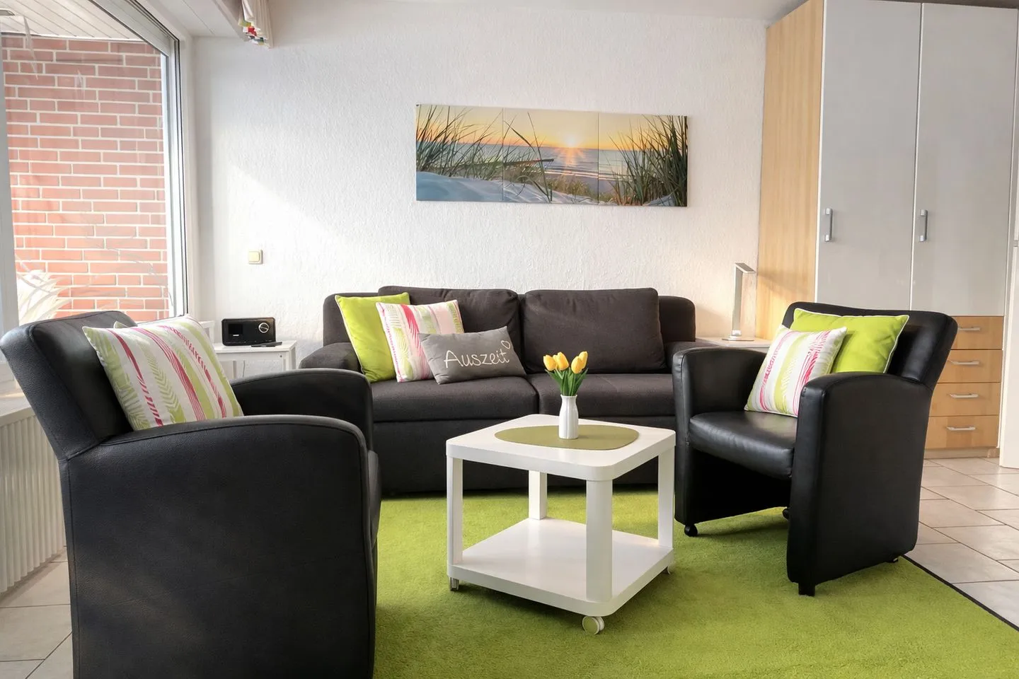 Direkt an den Wohnbereich schließt sich die sonnige Südterrasse mit kleinem, gepflegtem Garten an, der zusätzlich über einen eigenen Fahrradschuppen verfügt. Auf der Terrasse lädt ein Strandkorb dazu ein, die frische Nordseeluft zu genießen, zu entspannen oder den Tag gemütlich ausklingen zu lassen. Für moderne Unterhaltung und Kommunikation stehen Ihnen kostenfreies WLAN, ein Telefon im deutschen Festnetz, ein Flachbildfernseher mit Internetzugang sowie ein Internetradio zur Verfügung. Das Schlafzimmer ist mit zwei Einzelbetten in komfortabler Höhe ausgestattet und bietet erholsame Rückzugsmöglichkeiten. Die barrierefreie Dusche sorgt für zusätzlichen Komfort, während die durchgehend gefliesten Fußböden der gesamten Wohnung ein gepflegtes, modernes Ambiente verleihen.