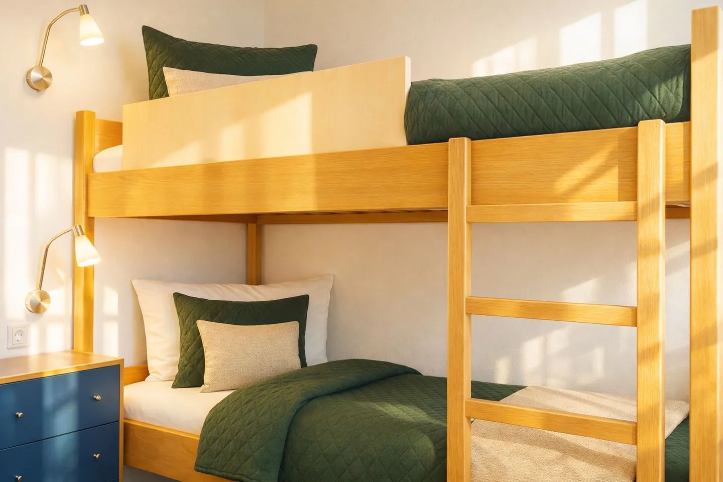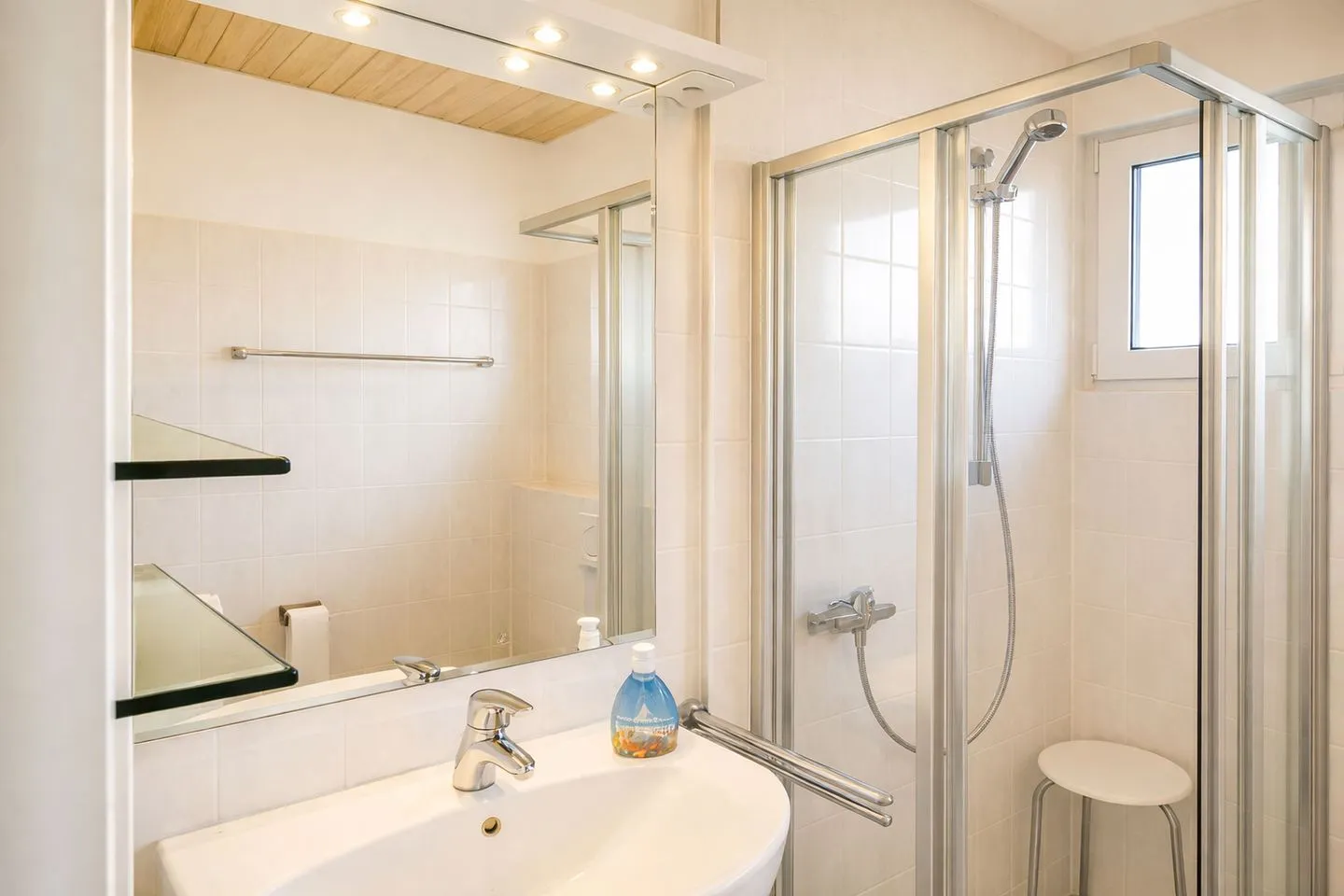 Das Feriendomizil verfügt über zwei Schlafzimmer, von denen eines mit einem Doppelbett ausgestattet ist, während das zweite Schlafzimmer ein Etagenbett bietet und sich besonders gut für Kinder eignet. Das Badezimmer ist funktional gestaltet und verfügt über eine Dusche sowie ein WC. Während Ihres Aufenthalts steht Ihnen ein kostenfreier WLAN-Zugang zur Verfügung.
