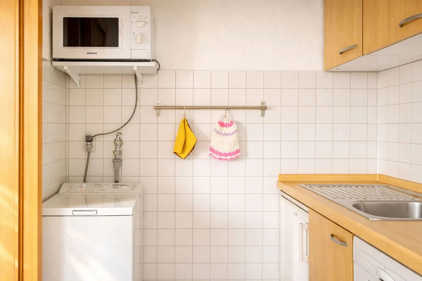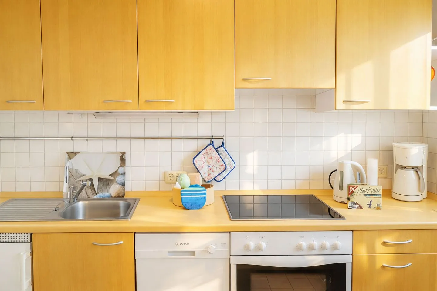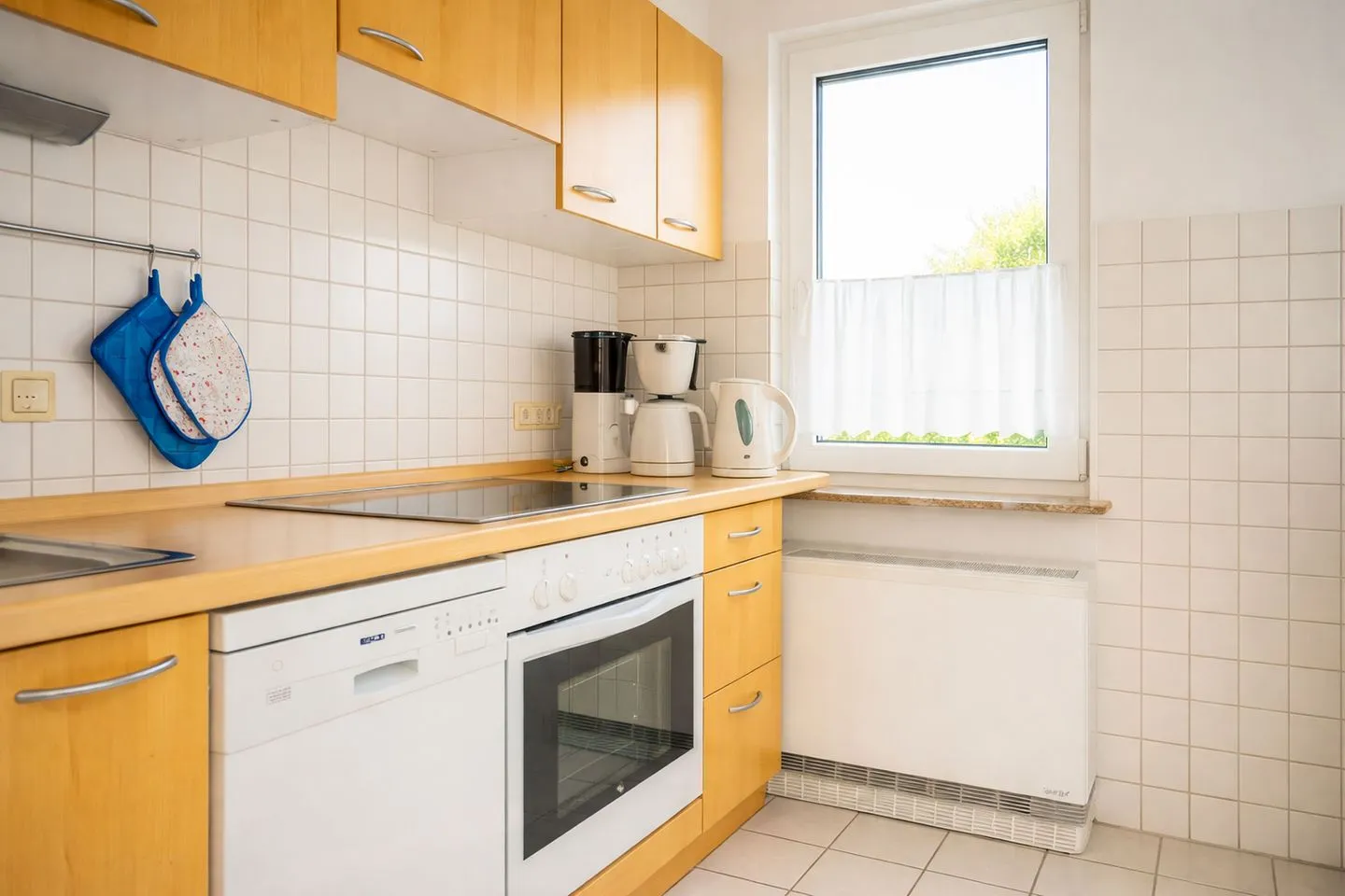 Die separate Küche ist vollständig und komfortabel ausgestattet und lässt keine Wünsche offen. Sie verfügt über einen Elektroherd mit Cerankochfeld und Backofen, eine Geschirrspülmaschine, einen Kühlschrank mit Gefrierfach, eine Mikrowelle sowie eine Kaffeemaschine, einen Toaster, einen Mixer, einen Wasserkocher und eine Waschmaschine. Damit ist das Ferienhaus auch für längere Aufenthalte bestens geeignet.